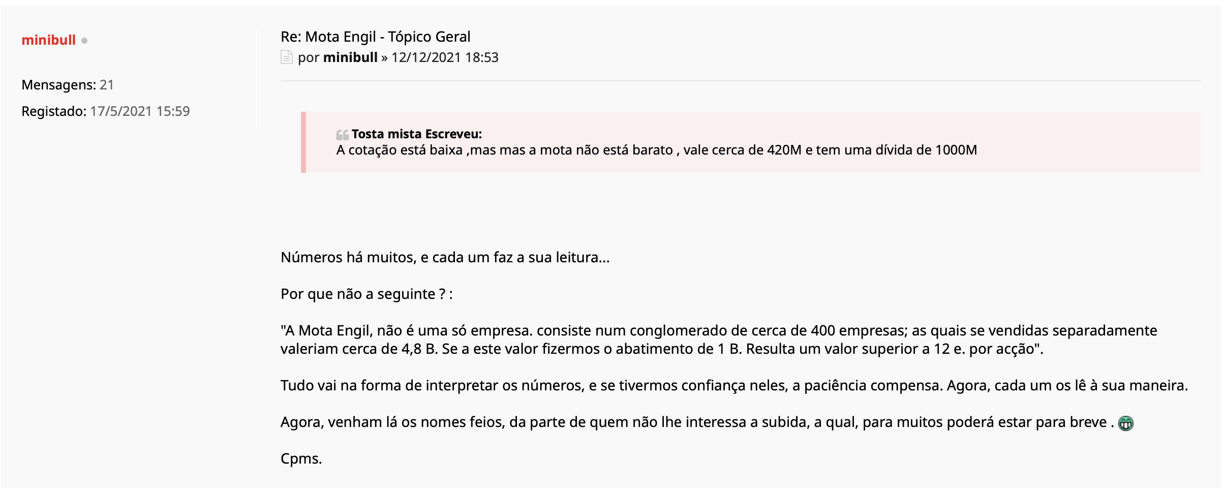 Não sei o que valem as outras 300 e tal empresas ou os 7 ou 8 biliões em pipeline de obras. E a dívida, não sendo baixa face ao EBITDA, não é estratosférica e bem melhor que alguns pares. Se a Mota estivesse num mercado de segunda divisão (não de primeira) valeria obviamente mais, parece-me evidente. Um pouco como o Benfica ou o Porto vs os clubes ingleses, franceses ou italianos, num exemplo simplista. Perdem logo na bolsa pelo sector, claro, mas também por estarem em Portugal. Haverá alguém que invista em clubes de futebol em Portugal numa lógica de all in? Claro que não…