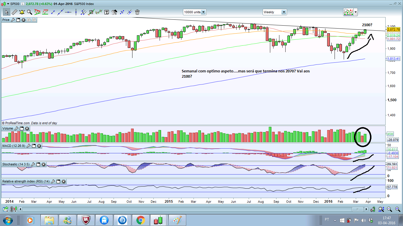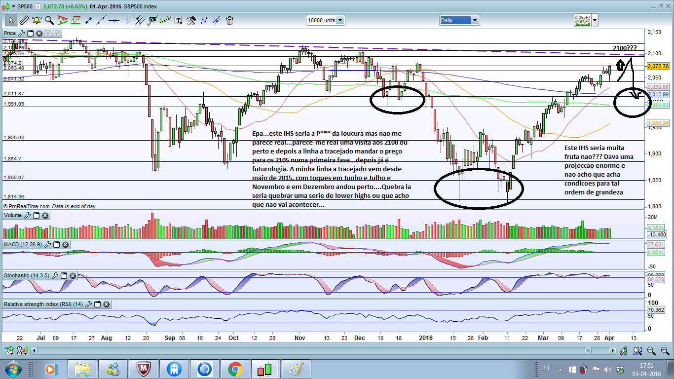 Quanto ao sp a ideia descrita algum tempo atrás é a do preço testar a zona onde está ou até mais acima 2100 e depois lateralizar entre esse valor e os 2020---1900 isto porque são duas zonas de suporte fortes, tal como os 2100 são uma resistência importante, daí as quedas esperadas talvez não sejam assim tão acentuadas.