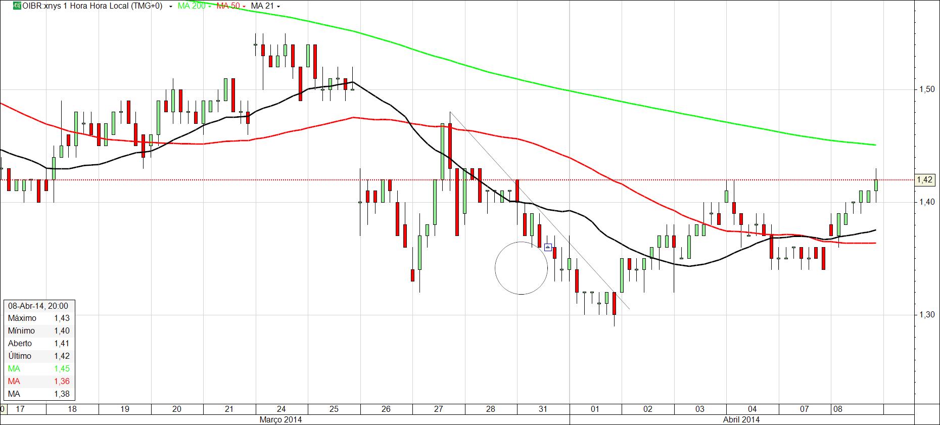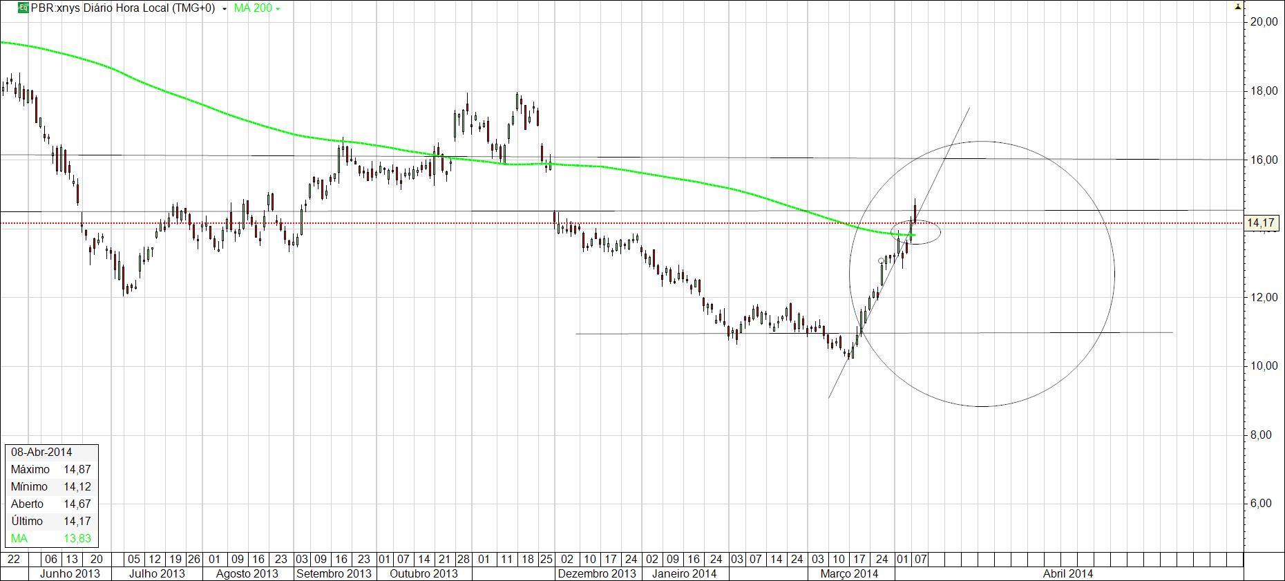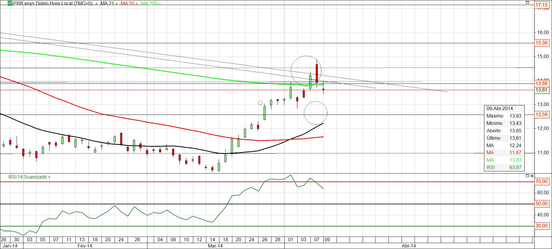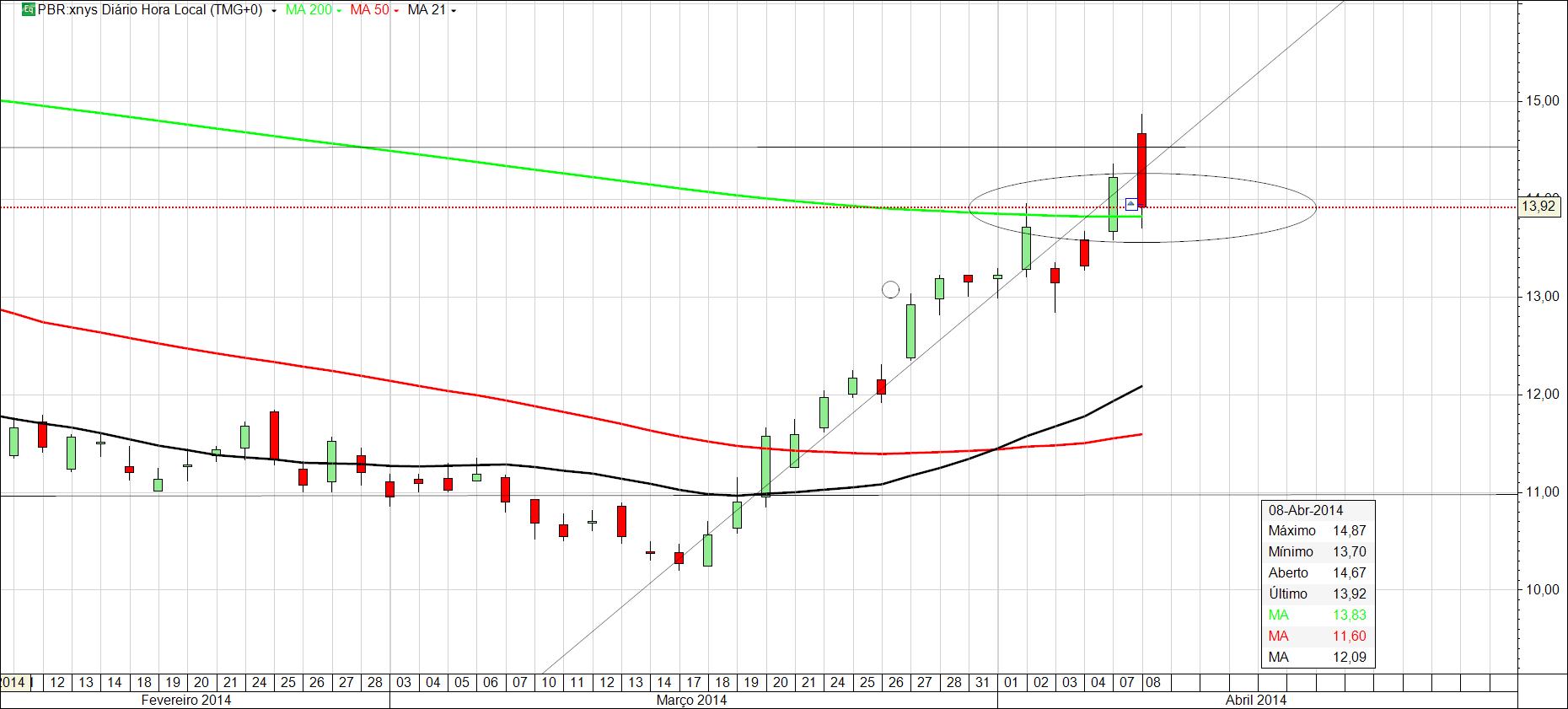 Como pode observar, a todos os novos passos, podemos aprimorar as entradas e saídas. No gráfico anterior, podes ver que poderia ter perfeitamente esperado por hoje para obter melhor preço. Ela chegou a ultrapassar a resistência mas voltou pra traz. Essa resistência dos 13/14, se rompida com mais volume, é bem possível termos mais uma perna longa em bull. Ai nesse ponto é que vai com certeza esgotar-se e entra numa laterização e quedas fortes, picos e fica difícil, mas até lá são apenas conjeturas, a PBR pode achar mais dois poços de petróleo que entretanto devido a alterações químicas transformou-se em ouro liquido. 8-) Não está difícil para você decidir PM, o dia mal começou.