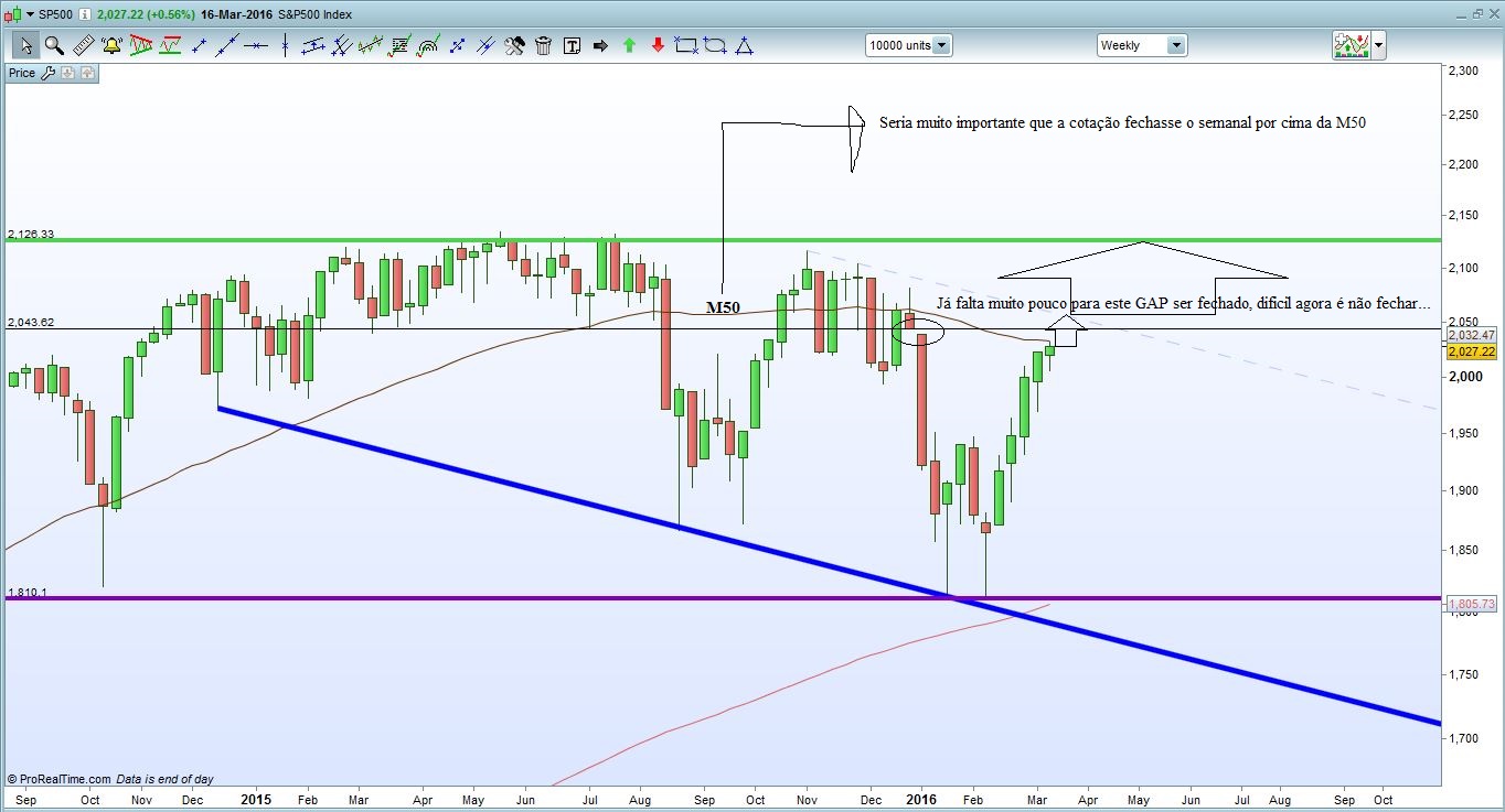 O S&P500 está a uma unhaca de fechar o GAP do semanal, mas o que me parece é que não existe nenhuma razão para que quando o fechar aconteça a tal famosa queda que tarda em acontecer. Pensando no modo Longo, que é aquele que me está a interessar para já, o dia de amanhã e de sexta são fundamentais, para além do fecho do GAP é importante que o Preço fique acima da M50 no semanal, se isso acontecer então acho que pode haver surpresas boas do lado longo.