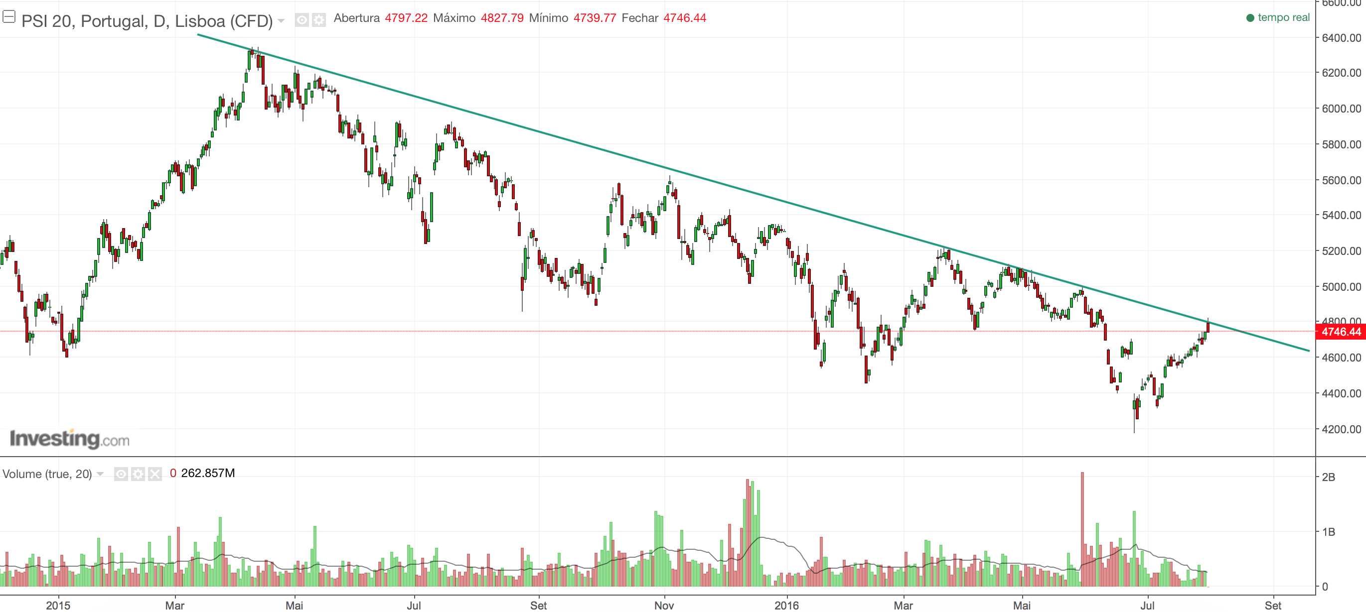 Não sou muito de ligar a noticias, mas com o polémico caso turco a acontecer tenho acompanhado os desenvolvimentos, quer pela TV quer pelos jornais. Pelo meio tenho lido noticias preocupantes, como a do FMI sobre a banca portuguesa e italiana, à beira da desgraça completa e de pelo caminho contaminarem o mundo. Tive também a oportunidade de ouvir o ACosta dizer que se o Novo Banco não for vendido liquida-se (estilo café lá do bairro), também temos um Brexit em curso e um perigoso Ditador Islamo-Nazi na Turquia (isto sim, preocupa-me muito). Posto isto e com cenários tão adversos fui ver os gráficos do PSI(xx) e fiquei surpreendido... o Prognóstico é positivo.