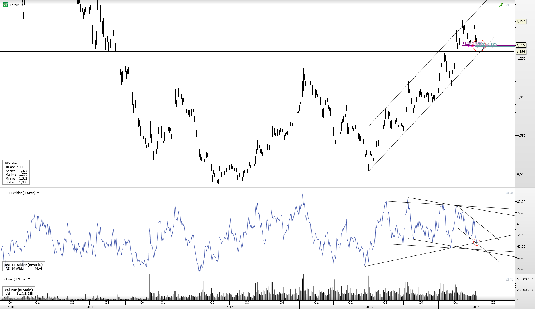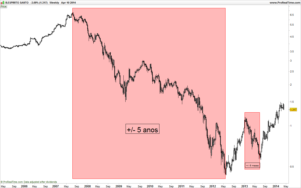 Aliás, é esse o comportamento do BES nos ultimos meses. Se formos visitar umas paginas atrás aguém já postou um gráfico que exemplifica bem isso. O BES ultrapassa um maximo relativo e depois vem visitá-lo durante a correccao seguinte.