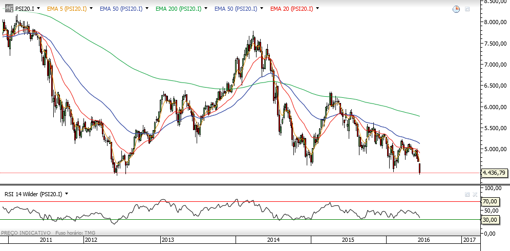 Conforme postado há uns dias atrás (23/5/2016 18:09) : VIX no semanal preparava-se para rumar para norte e o semanal do PSI em sentido inverso para sul. Previsível.