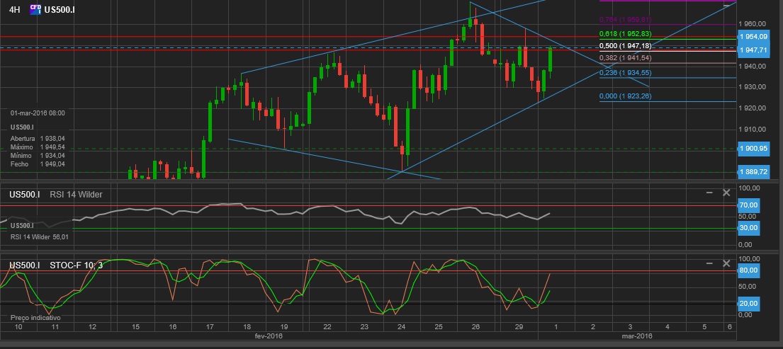 O S&P está a bater na LTA/linha inferior da cunha que o JAlves aqui colocou em conjunto com a broad, e também na retracção 61,8 no gráf 4H.