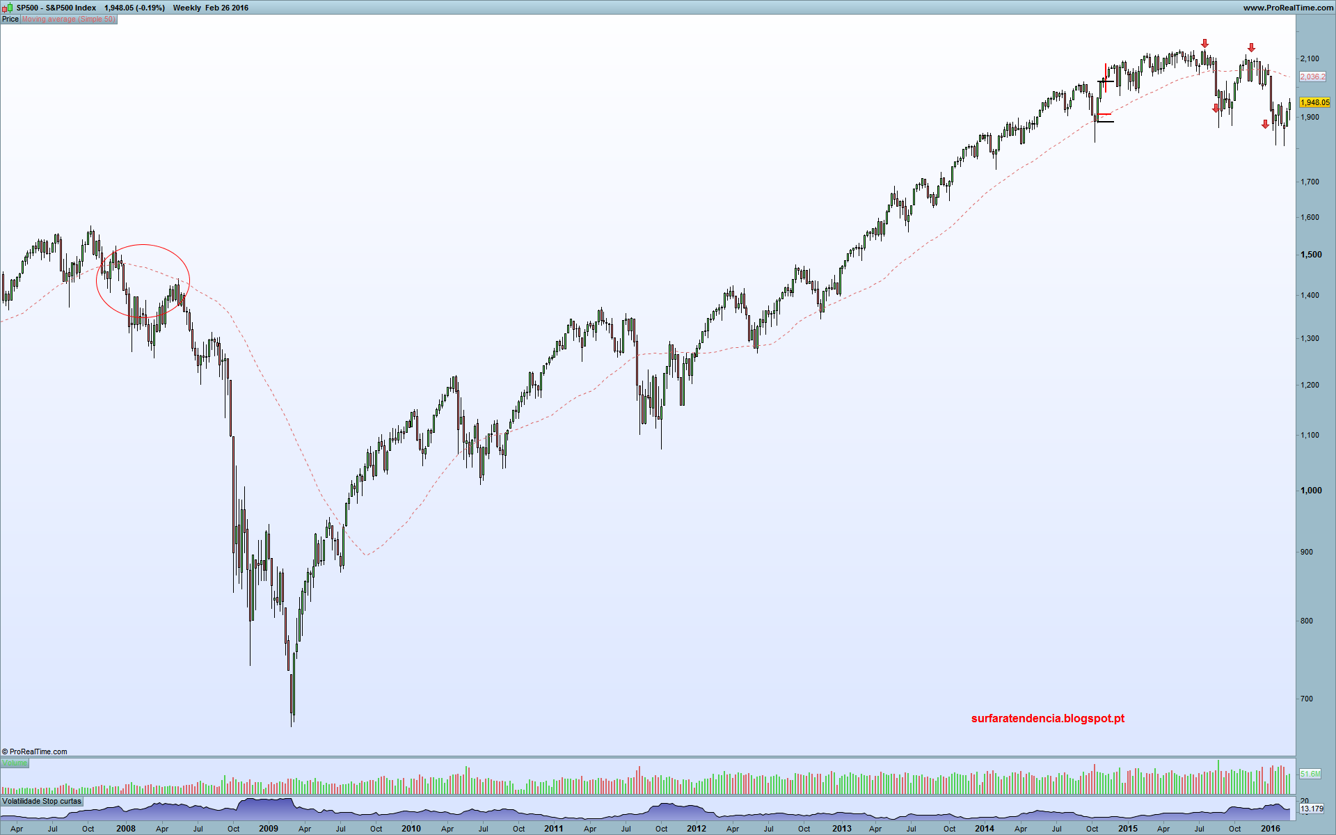 Se olharem para o gráfico semanal repararão que os movimentos major continuam a fazer lower-highs, característicos de bear markets. Apesar do bom momento do índice, e do tal potencial de reacção que poderá levar-nos um pouco acima dos 2000 pontos, acredito num cenário semelhante ao de inícios de 2008. Reacção ascendente anémica até perto de máximos, novo mínimo relativo, e depois dá-se o sell-off. Digo isto com isenção, já que não tenho neste momento qualquer exposição ao índice Americano. Para já, mesmo que aconteça uma reacção em alta, continuo a achar demasiado perigoso testar uma entrada longa.