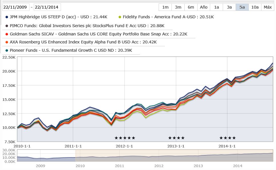 Através da análise do gráfico a 5 anos podemos dizer que não há uma grande diferença na performance entre os diferentes fundos, não se notando assim uma grande discriminação entre os gestores dos fundos. Isto, em parte, é justificado pelo facto do mercado acionista dos EUA ser um mercado muito grande, que representa cerca de 50% do total do mercado acionista mundial, sendo que, devido a essa grande quantidade de ativos, este mercado é o que apresenta menos as designadas caudas gordas ou ineficiências do mercado, pelo que a qualidade de stocks picking por parte dos diferentes gestores é mais homogénea e não tão discriminatória como no caso dos mercados emergentes aonde há uma maior frequência dessa caudas gordas.