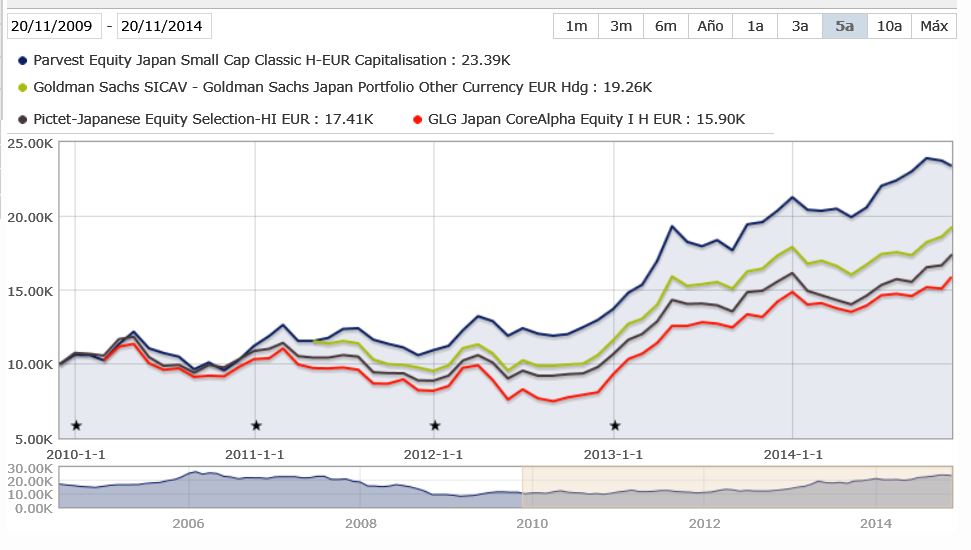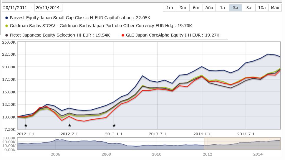 R2 Escreveu:Comparação entre os melhores fundos do Japão a 3 e 5 anos de retornos acumulados, na categoria Morningstar Ações Japão Moeda Hedged, na moeda EUR e nas classes de retalho: