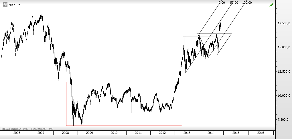 Olhando para o Nikkei, não restarão dúvidas quanto à tendência. No rectângulo destaco a minha tese para o psi20, com as necessárias adaptações.