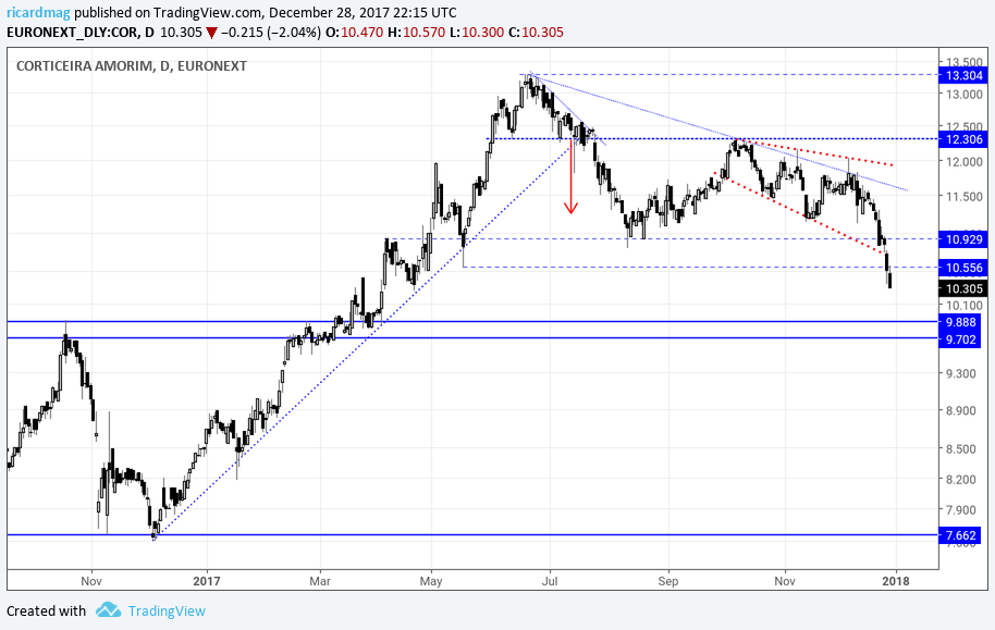A corticeira está em correcção de curto prazo e já abaixo da MM200 e perto de 2 suportes fundamentais