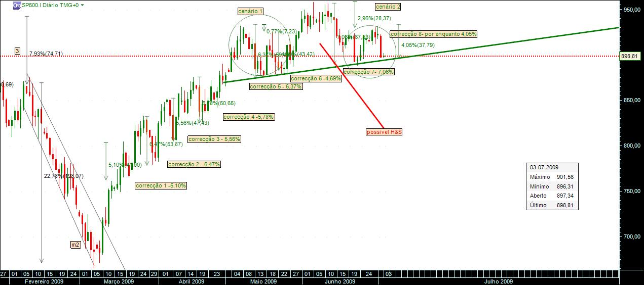 Agora muitos pensam que podemos ter uma correcção forte, ora bem, até á data o SP não quebrou a LTA traçado a azul, ainda não fez uma correcção inferior a 7. No grafico podemos ver um possivel H&S. Outro dado é que no cenario 1 tambem nos dava uma ideia que iamos ter uma correcção forte que quebrasse o minimo da correcção 5, no entanto nada disso aconteceu e fomos fazer outro novo maximo, mas no cenario 1 e 2 a maior diferença vai neste momento na diferença percentual entre maximos, enquanto no cenario 1 foi de 0,77% no cenario 2 foi de 2,96%. O que pode nos dizer que o indice esta a perder a sua força de subida e é possivel que o H&S seja quebrado em baixa mas não se esqueçam que o mesmo tambem pode ser quebrado em alta. Neste momento não aposto em nenhum, mas continuo um pouco bull nos meus trades para este indice