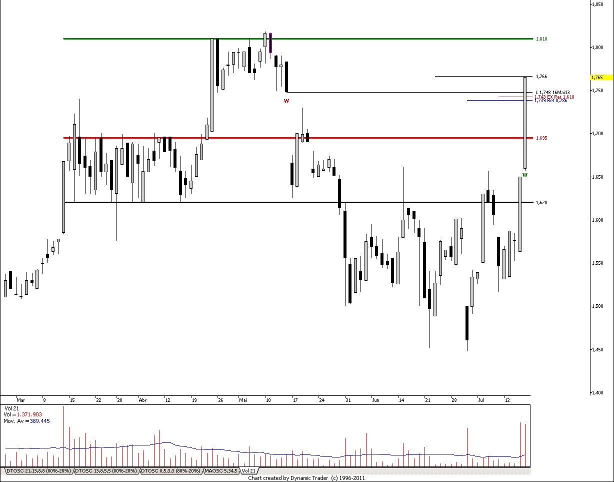 Abriu hoje, formando uma rising window e fechou a falling window, formada no dia 17 de maio.