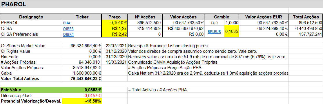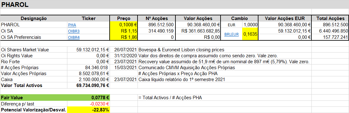 Fair value da PHArol, com a cotação da Oi a R$1,14 e com o câmbio a 0,1635 (ou 6,12 reais/euro), é de 0.0794€. A 0,1008€ Está a cotar mais de 20% acima daquilo que ela vale! São cerca de 20 milhões de € de diferença. Nas minhas contas assumo que o recovery value da Rio Forte é zero, assim como zero é o valor dos direitos que a Pharol possui na Oi.