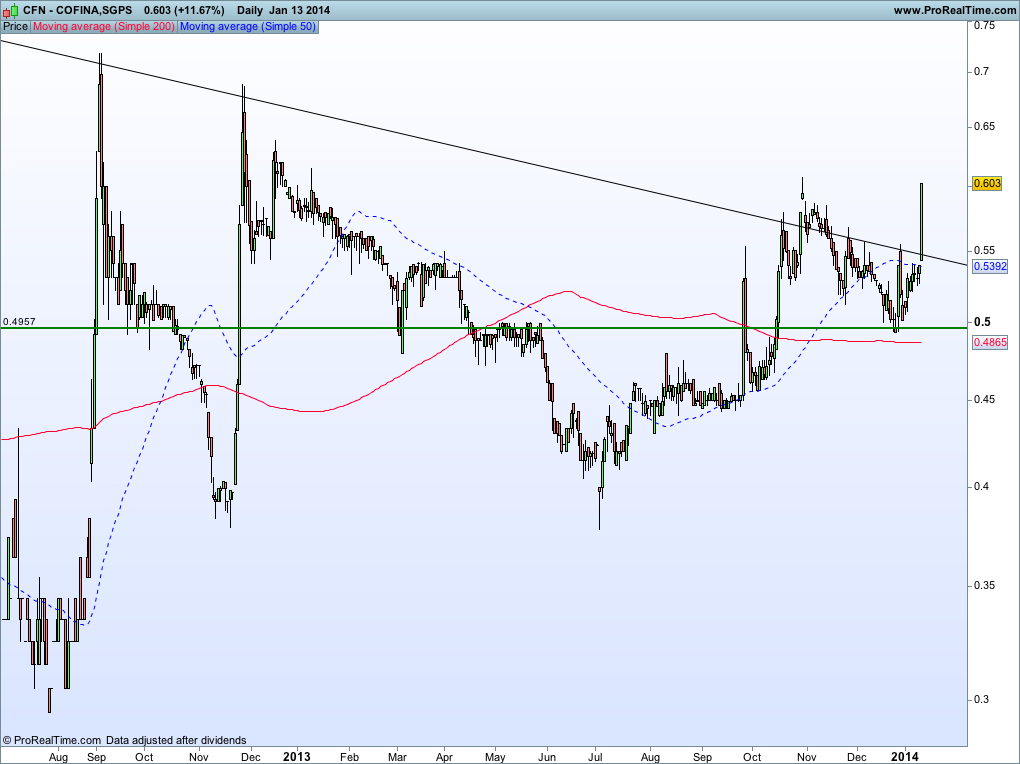 , mas enquanto continuar este volume com velas diárias "catitas" tem condições para subir ainda mais. Se a LTd for realmente quebrada e posteriormente a resistência nos 0,70€ considero que a Cofina entrou em Bull Market, e se assim for o ano de 2014 seria potencialmente bastante positivo.Agora nos mercados, como sabemos, temos sempre que esperar todos os cenários possiveis, reteste à LTd, falso breakout, ir directo à resistência, lateralizar, etc.