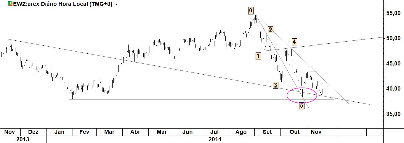 Especialmente para ti, BedRock: um gráfico do EWZ. Às vezes sabe bem deixar o gráfico marinar alguns dias e depois abri-lo e ver como o preço se comportou em face das linhas e zonas desenhadas.