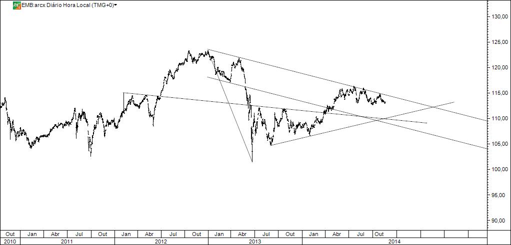 Olhando para os gráficos diários do iShares J.P. Morgan USD Emerging Markets Bond ETF (EMB) e do iShares MSCI Emerging Markets ETF (EEM) não vejo nada de especial, a não ser...![]()