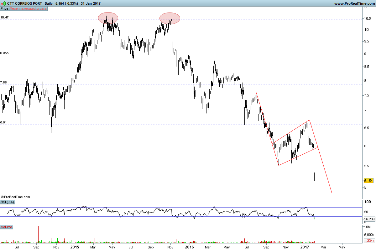 Se a ideia for apanhar um ressalto técnico diria que a zona dos 4,8x é interessante, RSI oversold (diário e semanal) e target da mega bear flag muito perto de ser atingido. Falta a vela de hoje.