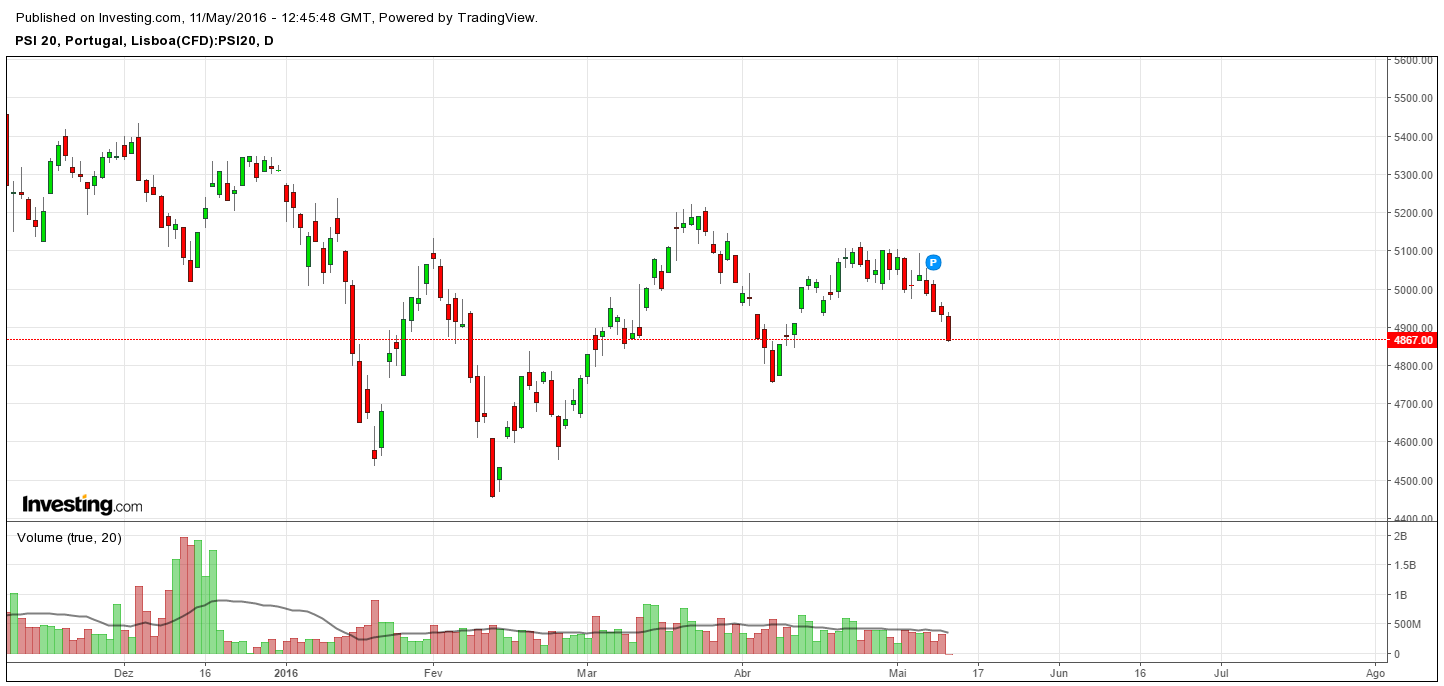 Os últimos dias têm sido bem representativos do estado do PSI20. Os mercados sobem e o PSI20 cai, os mercados corrigem e o que faz o PSi20? Aproveita para cair mais um bocadinho. Isto não está fácil por cá.