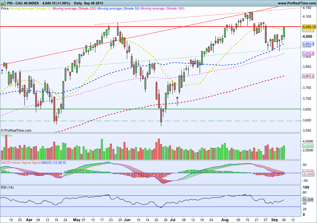 O CAC hoje vai com um belo balanço. A continuar assim pode quebrar a resistência dos 4080 e picos. A ver vamos como fecha hoje, e se o final da semana confirma mesmo o romper da resistência. Era interessante ver esse cenário, até porque pode ser que sirva de exemplo para muitos outros índices europeus que estão a tocar as resistências, tipo PSI20