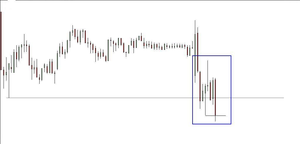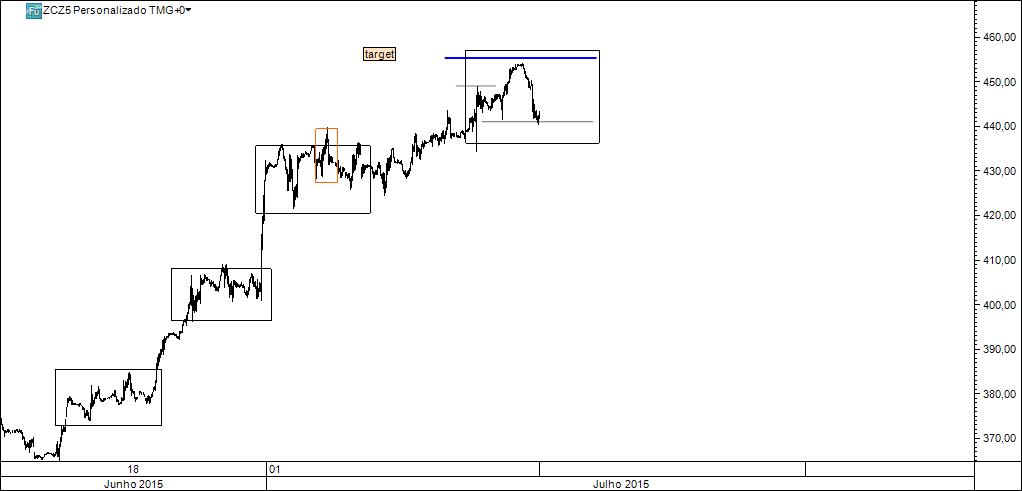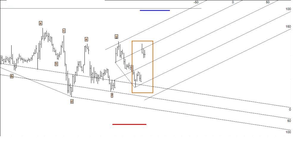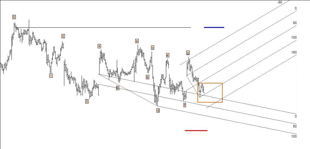 Delineando uma oportunidade especulativa: compra na caixa se o preço aí chegar e estancar por um período de tempo razoável, stop abaixo do pivot em medida equivalente ao atr deste timeframe e target no último high. Técnica: triplo fundo.
