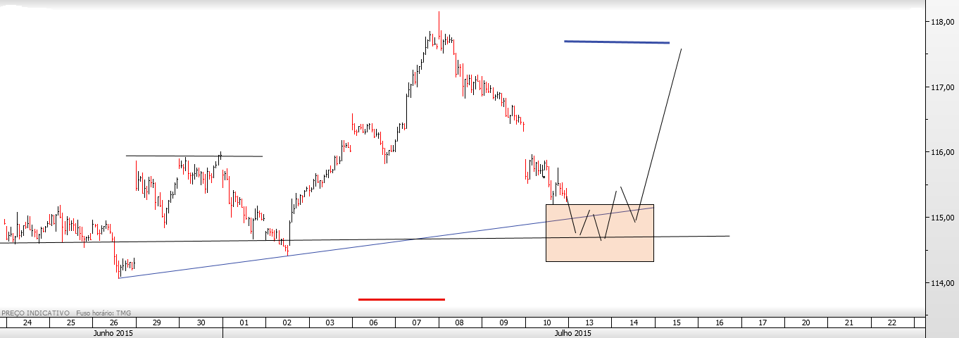 O Alquimista Escreveu:Delineando uma oportunidade especulativa: compra na caixa se o preço aí chegar e estancar por um período de tempo razoável, stop abaixo do pivot em medida equivalente ao atr deste timeframe e target no último high. Técnica: triplo fundo.