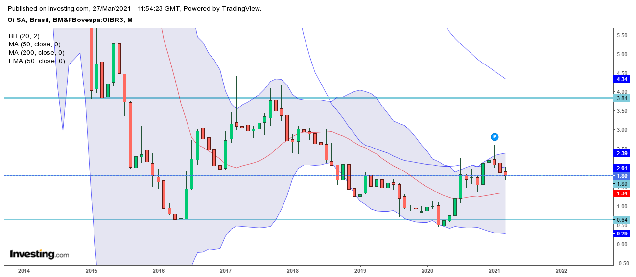 Aqui vai o mensal da OIBR 3. Breakout da zona dos 1,8$ onde subiu até onde conseguiu e agora o resteste à base, que passou a suporte (com sucesso até ao momento). Diria que agora teria as condições para continuar a subir. MM200, no diário está mesmo a suportar o preço, quem sabe não dá um empurrão. Ou não.