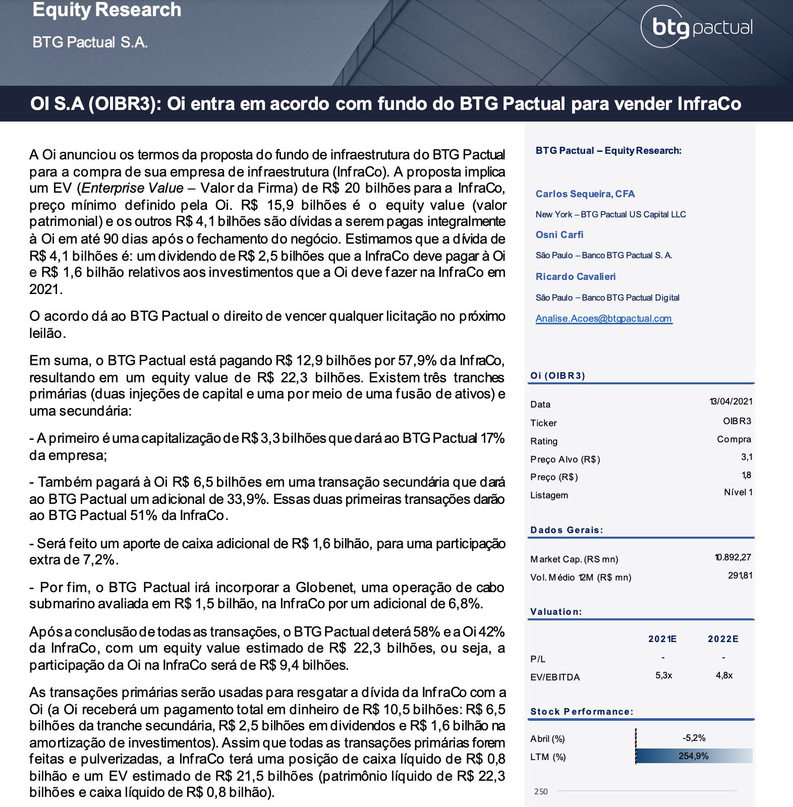 Conforme demonstra a analise do BTG, após a operação a InfraCo vai ficar somente com 0.8B de reais em caixa. A estimativa do EBITDA ronda os 1B em 2021 e 2B em 2022.