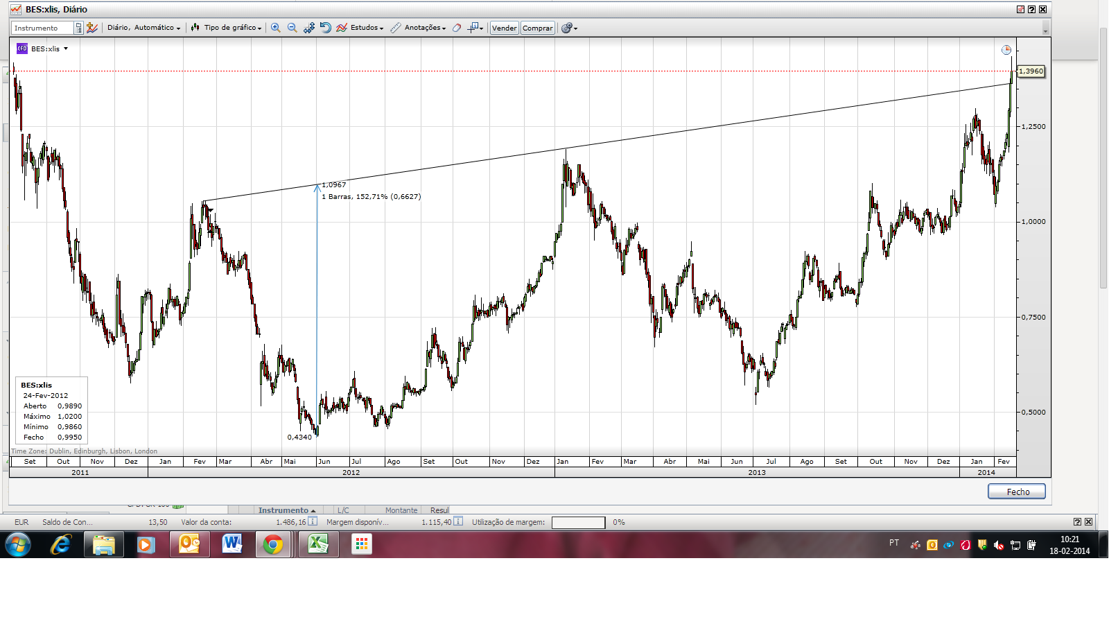 Não aguentei a pressão e saí a 1.397...embora tenha ido aos 1.435 não me parece que consiga vencer esta batalha tão facilmente...principalmente depois de vir dos 1.04 quase sem respirar. Posso estar enganado mas 12% de lucro já estão do meu lado.
