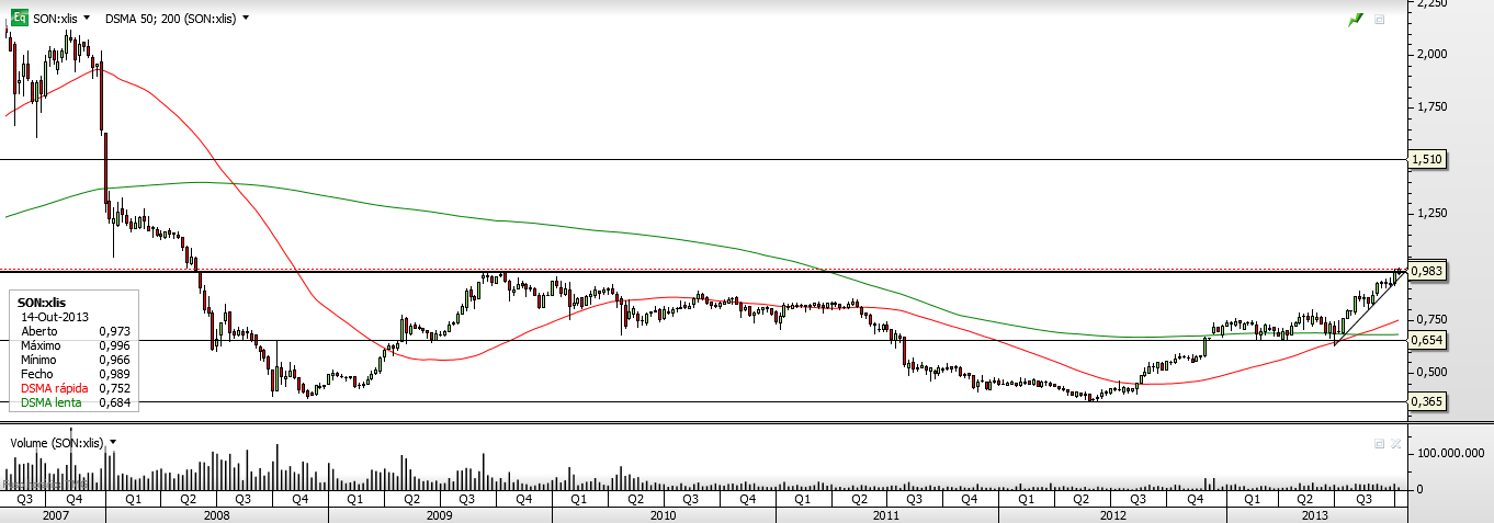 cocanegra, observando o gráfico da Sonae SGPS dos últimos 9anos, a próxima resistência parece-me que se situe na casa dos 1,60-70€! Até lá parece-me que não tem nenhuma resistência relevante. Não sei se lá chegará, mas que tem caminho aberto, lá isso tem.