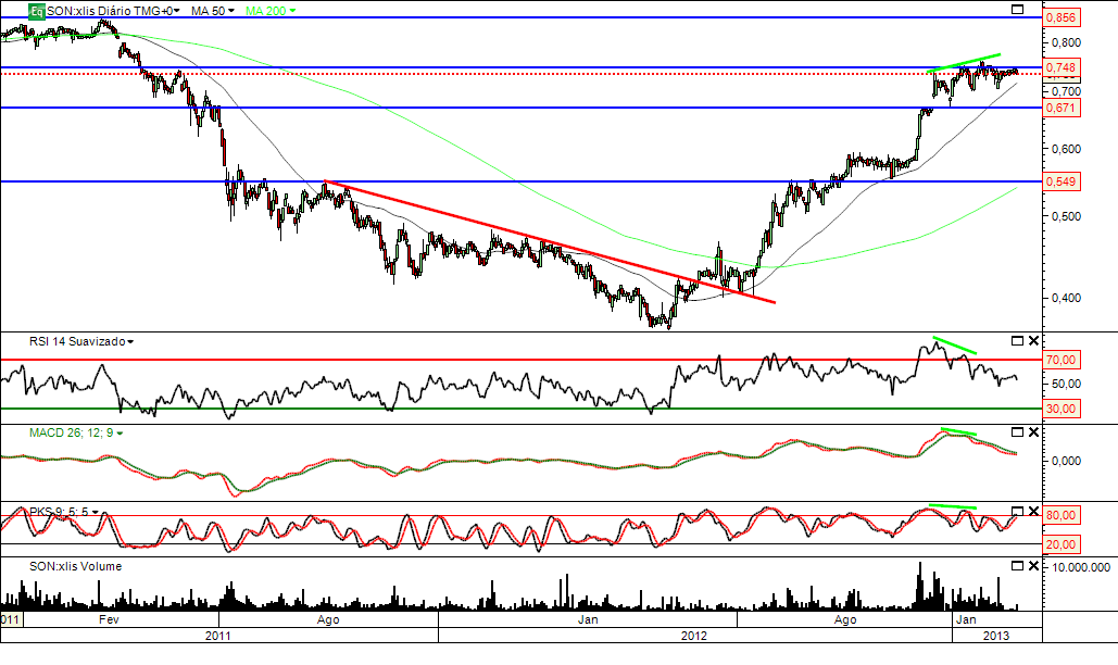 Ulisses Pereira Escreveu:Apesar da turbulência no PSI, a Sonae tem conseguido aguentar-se acima do seu suporte (antiga resistência)na zona dos 0,74 euros. Seria muito "Bullish" se o conseguisse fazer. Mas penso que isso está altamente relacionado com a capacidade do PSI aguentar o suporte entre os 5500 e os 5700 pontos.