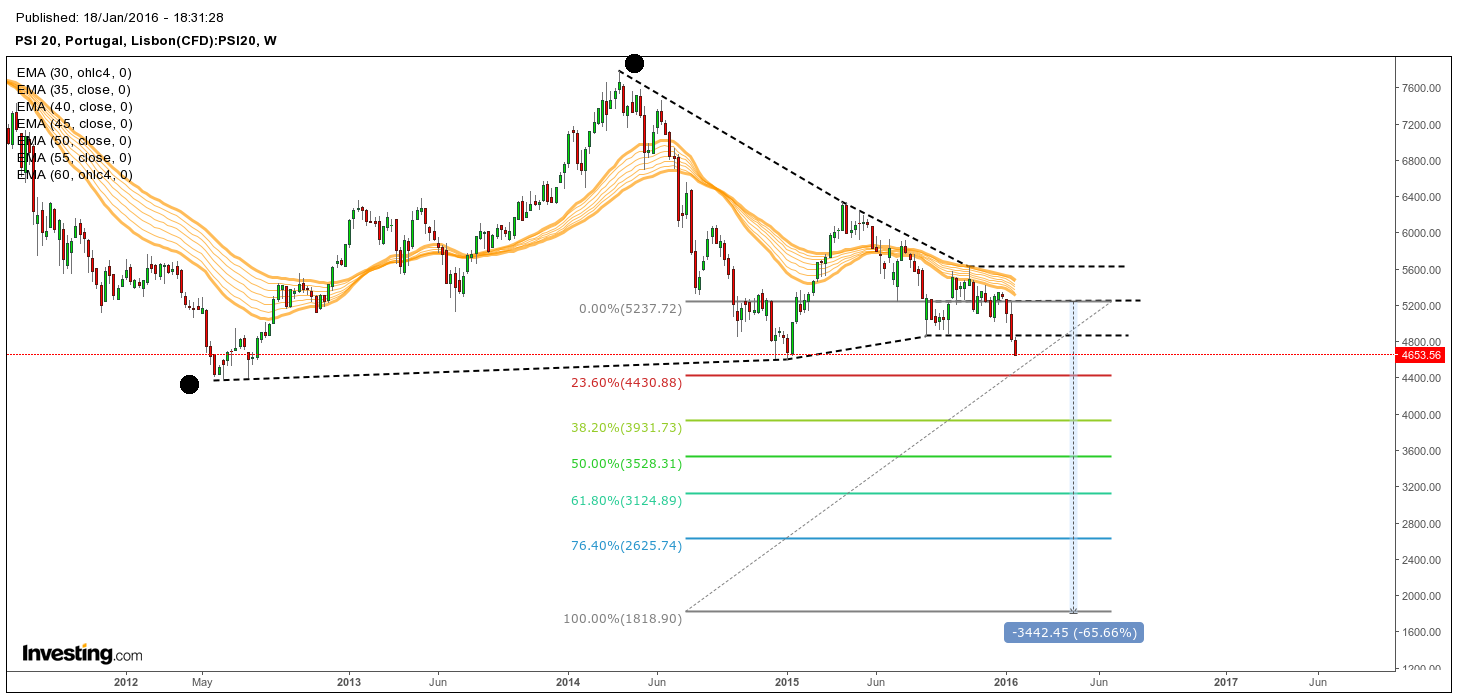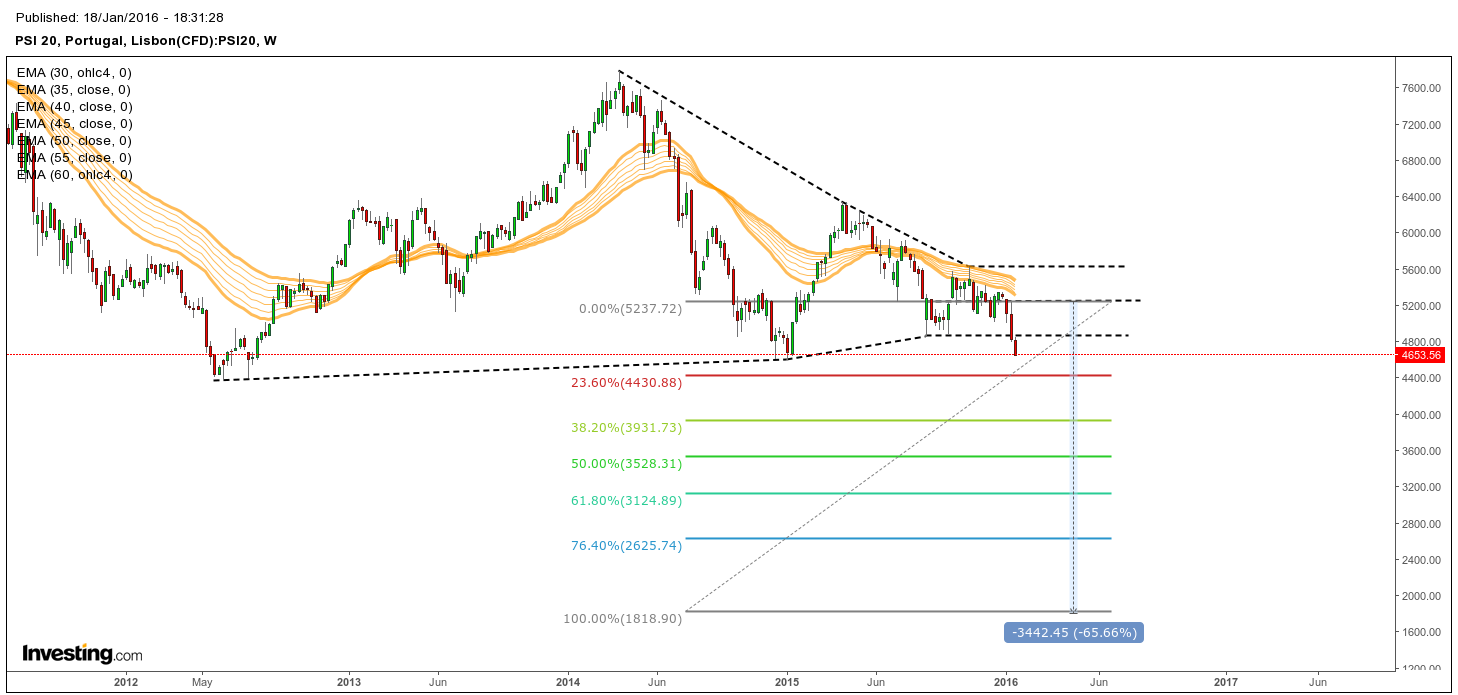 Isto de investir na bolsa é um jogo de probabilidades. Do ponto de vista da análise técnica, os gráficos indicam que existe a probabilidade de o PSI-20 atingir os ~1800 pontos, que resultam das projecções geométricas das estruturas formas pela cotação do índice. Se vai lá chegar? Não sei, o cenário parece-me bastante "bearish" no longo prazo, mas pode ser que a geopolítica e o BCE invertam o cenário. A ver vamos. Tendo uma posição "short", há que geri-la de forma adequada e esperar que o mercado nos diga que estamos errados. Se chegar à cotação projectada, óptimo. Caso inverta a tendência a meio caminho, também já é um "short" jeitoso.