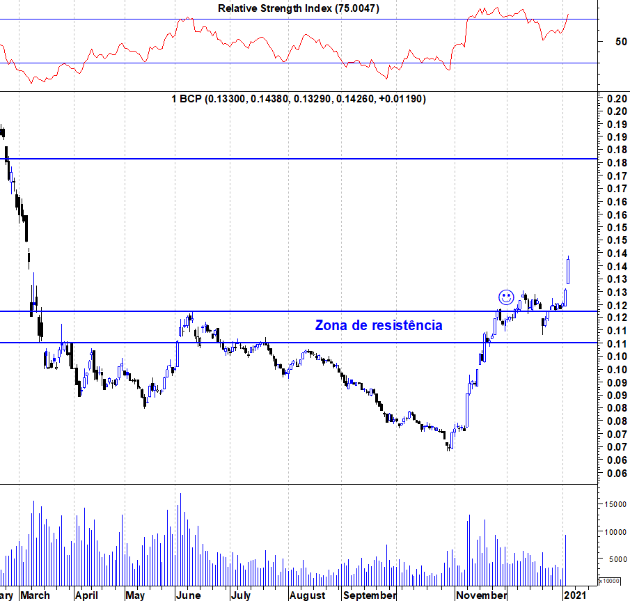 O BCP tem uma forte resistência em 16. é pouco provável que a passe assim de um fôlego.