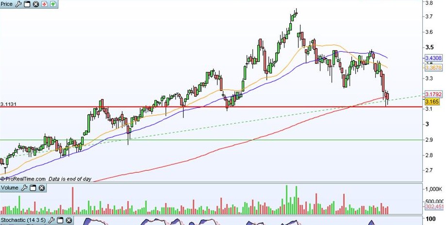 Depois de uma acentuada correcção até à sua resistência dos 3,1-3,15, curiosamente coincidente com a MM200, parece estar a começar a reagir e ser um excelente ponto de entrada. Tanto mais que as quedas se efectuaram com uma redução de volume.