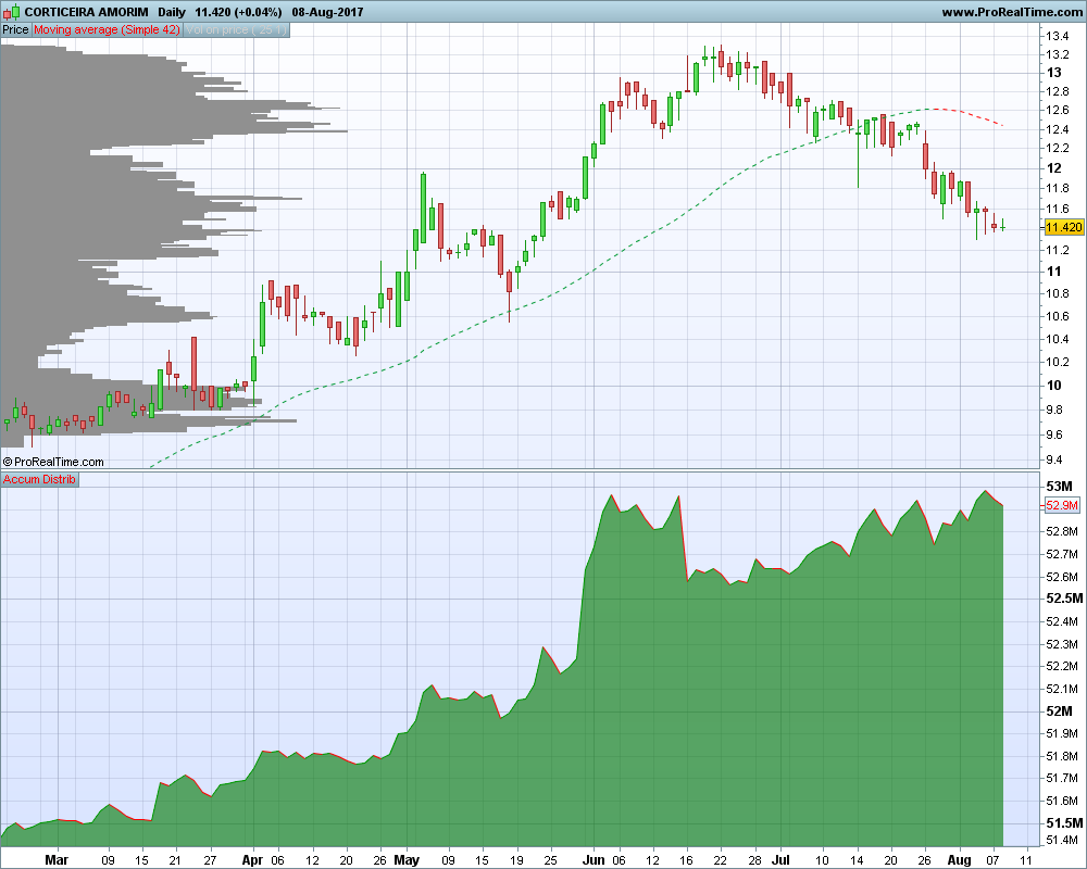 Bom, hoje tive que ser disciplinado e fechar a posição que tinha há mais de 8 meses na Corticeira com base na minha forma de estar neste mundo da bolsa, a AT. O gráfico diz-me que pelo menos uma retracção mais forte que o usual é provável, pelo menos até ali à zona dos 11€, onde não me importaria de reentrar caso desse sinais para isso. Ou até mais abaixo, quem sabe voltar aos 10€. Ontem, com bastante volume, quebrou a neckline de um H&S e hoje quebrou um suporte que considero importante igualmente com forte volume, fechando quase em mínimos da sessão. Ainda fiquei à espera que pudesse fazer um martelo na recta final mas não aconteceu, pelo que nestas coisas não se pode ter amor às acções, apesar de ser uma empresa de que gosto bastante pelo que conheço dela. Vou acompanhando para tentar um dia reentrar.