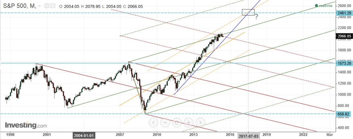 há pouco tempo vi-te falar do sp500 como "sp2500" e resolvi tentar perceber o que te teria levado a falar desse valor. por isso, experimentei o gráfico mensal, tracei center lines e respectivas al's e rl's, bem como a trend line a azul, e vi a confluência de linhas no gráfico a apontar precisamente para esse ordem de valores como possível destino do preço e eventual limite para este movimento de subida (para além do mais, traduzir-se-ia num hagopian em relação à wl da fork ascendente, desse ponto de vista faria sentido).