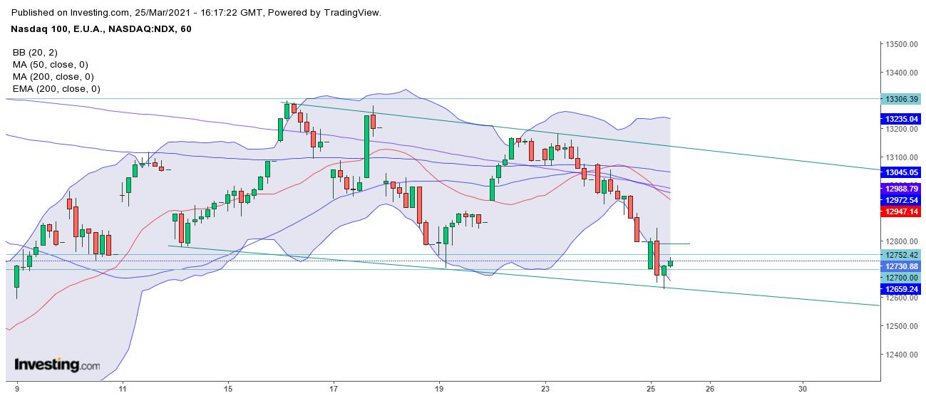 A zona dos 12700 a suportar o indice. No gráfico horário, é visível a quantidade de vezes que já o fez. A pergunta de um milhão de dólares é se vai aguentar uma vez mais...