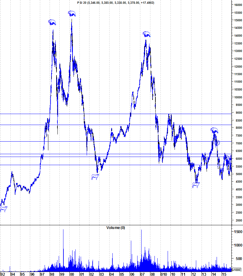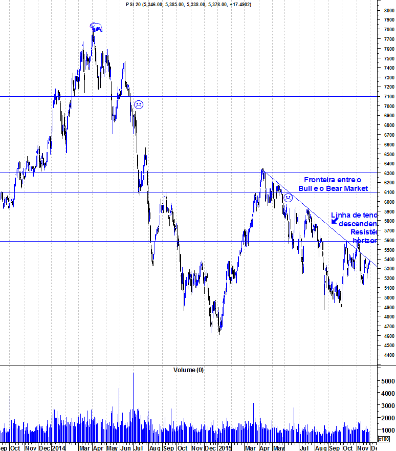 Mas mais importante que esse valor, é a resistência na zona entre os 5550 e os 5600 pontos. É a quebra dessa resistência que poderá sinalizar alguma mudança de curto/médio prazo no PSI. Já para o longo prazo, continuo a manter a fronteira entre o "Bear" e o "Bull Market" nos 6300 pontos.