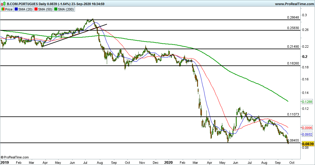 Ontem o BCP acabou por fazer mínimos de sempre, mais uma sinal de fraqueza (entre muitos), sem qualquer sinal de inversão, bem pelo contrário...