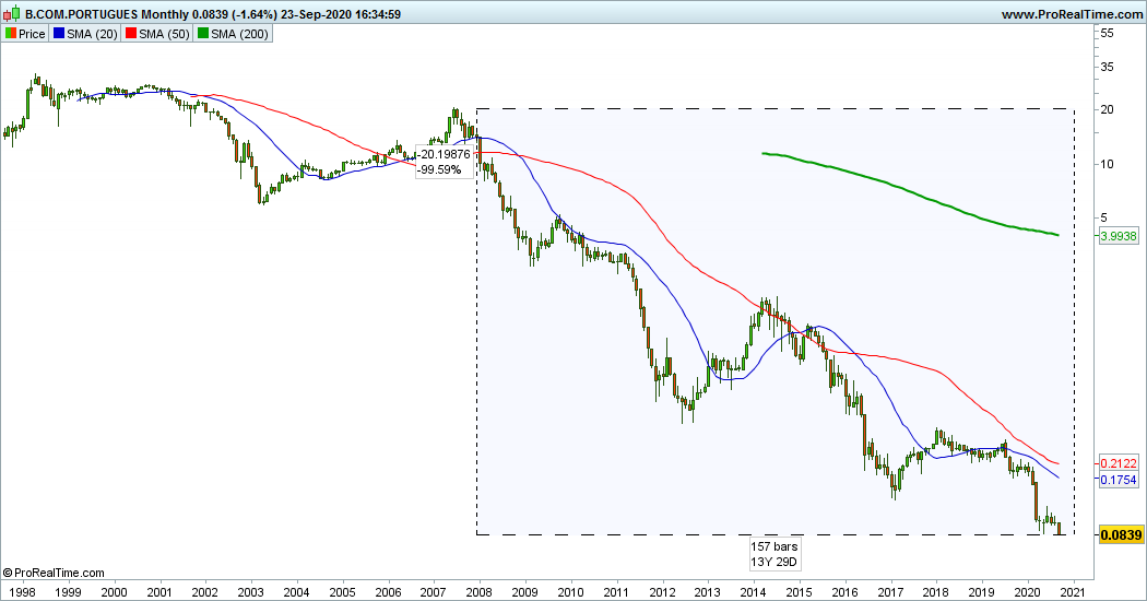 Deixo o gráfico mensal do BCP, com a desvalorização desde 2007, mais de 99%...perda brutal e impensável nessa altura.Mas a realidade é esta.