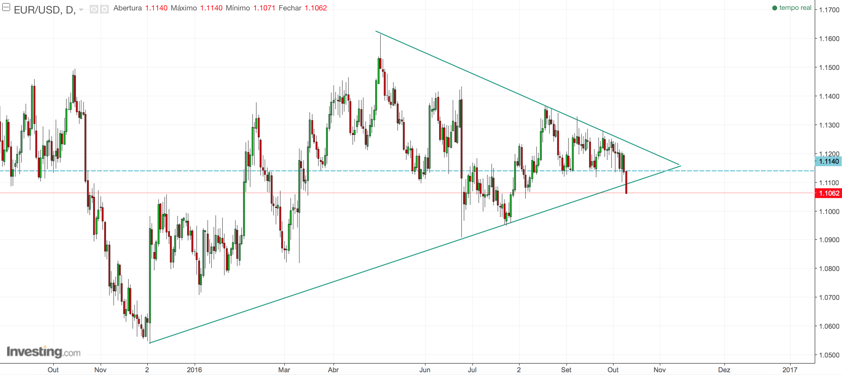 O que diz terá todo o sentido e certamente que pressiona a desvalorização do Euro. Mas por outro lado isso dificultaria uma subida dos juros americanos... e lá estaríamos de volta a este equilíbrio que se tem traduzido nesta longuíssima lateralização (mas que agora afunila na forma de um triângulo simétrico). Eu da minha parte continuo com a mesma análise que já aqui mostrei. É óbvio que estas descidas não são fáceis para quem está longo mas o que é um facto é que elas acabam por ser neutralizadas...