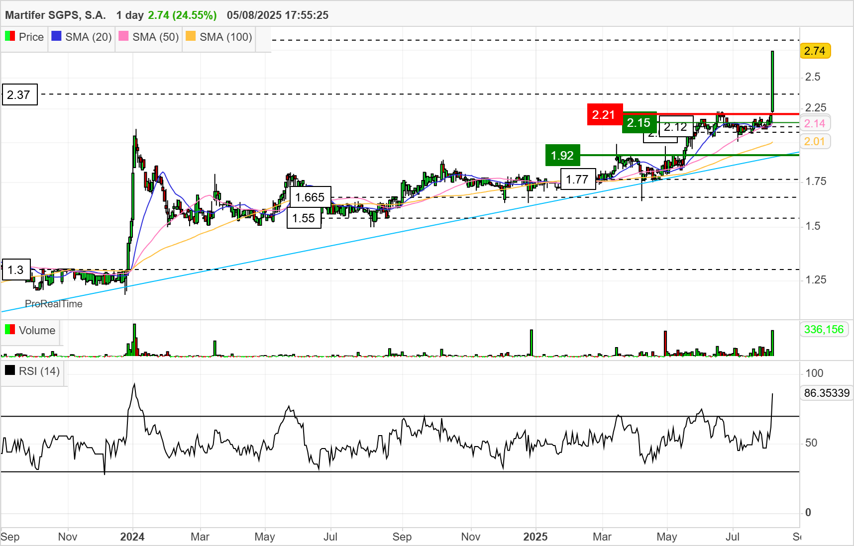 Hoje foi dia de máximos relativos de muitos anos na Martifer esta cotação já não era vista desde 2010, deixo um grafico de mais curto prazo mas onde é visivel que no ultimo arranque semelhante deu um salto de 1 euro na cotação , será que vamos ter alguma surpresa