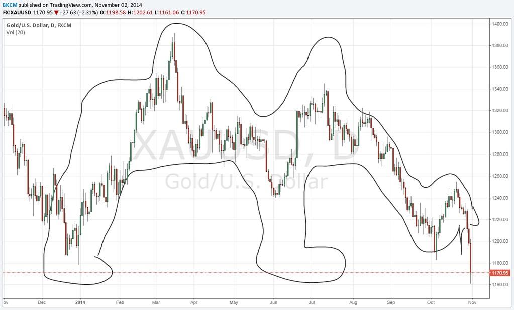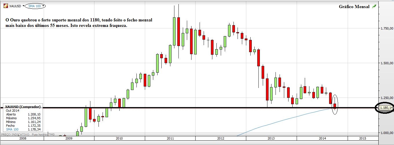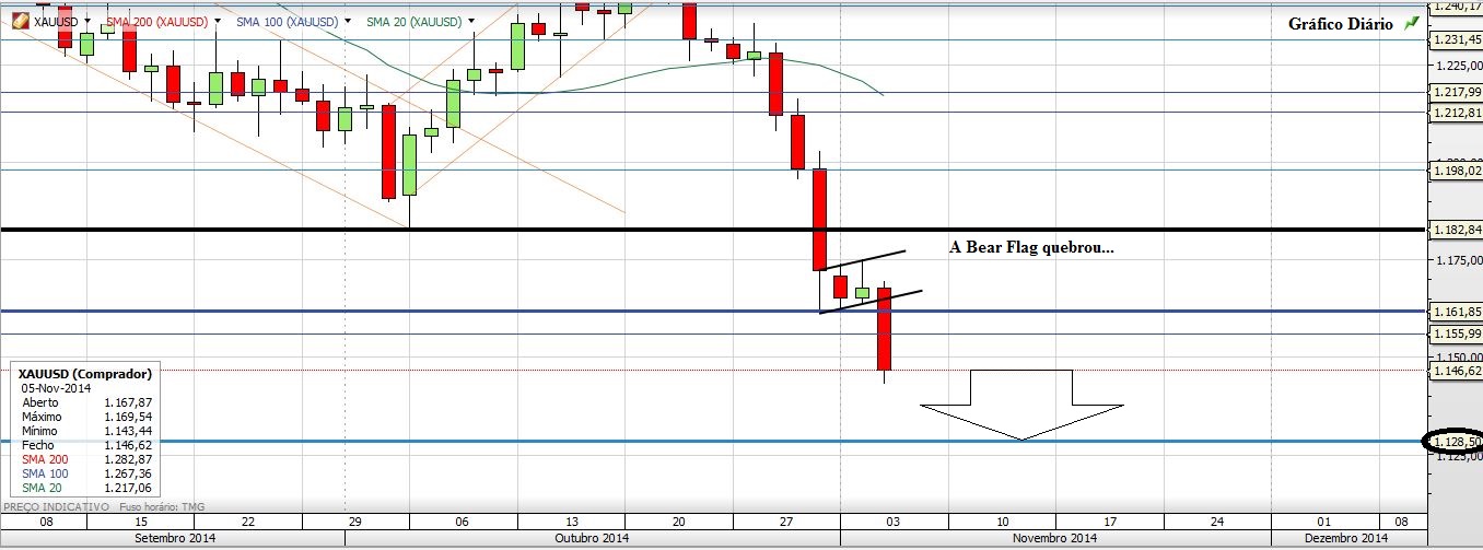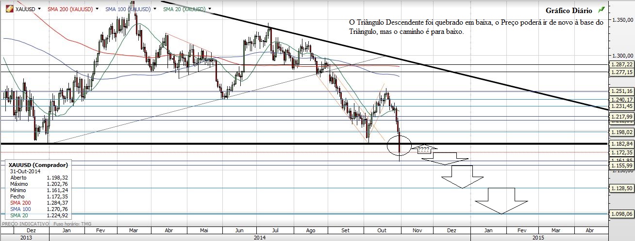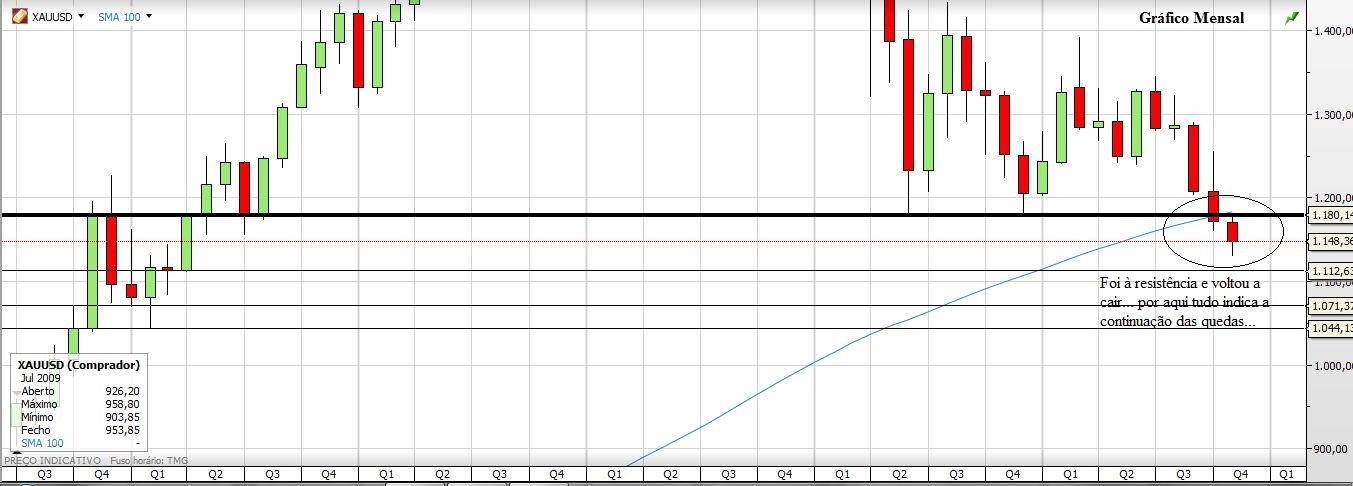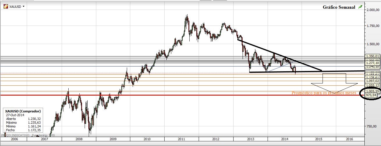 Deixo aqui a minha ideia para o Ouro, esse outrora nobre metal e sobre o qual o prognóstico continua a ser de queda.