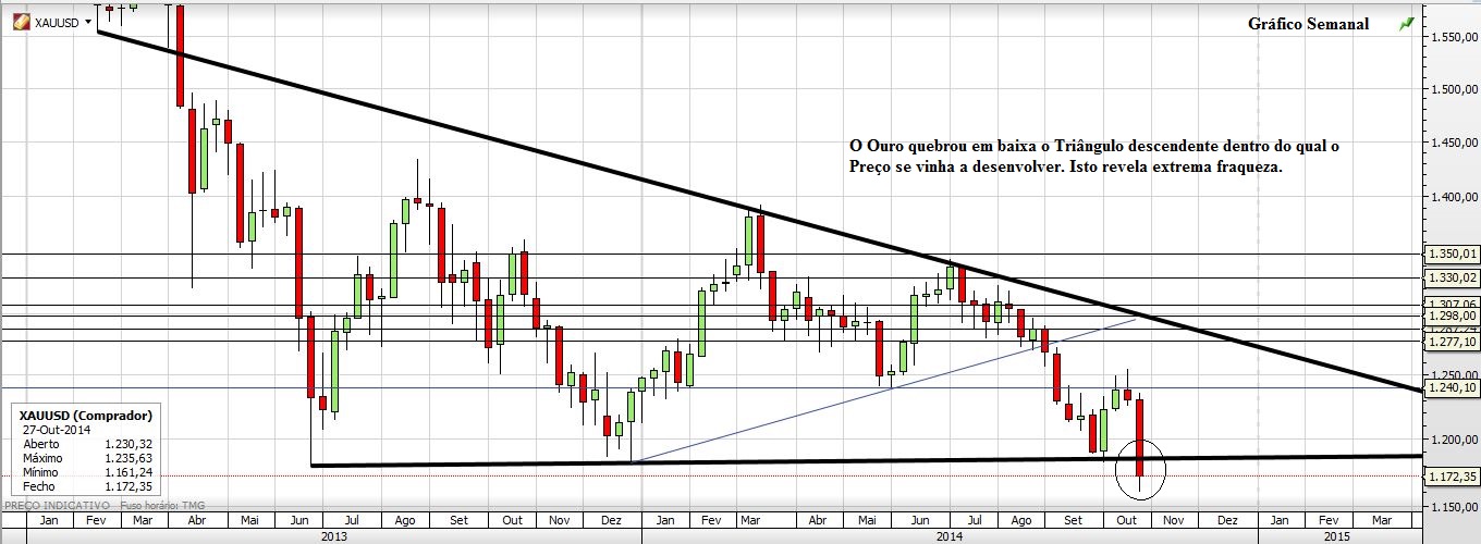 O Ouro depois de quebrar em baixa o suporte dos 1240 foi quebrando suportes em série, rematando a semana com a quebra em baixa do Triângulo Descendente. Este facto é muito significativo e revelador de extrema fraqueza. Na minha modesta opinião o festival da queda ainda estará longe do fim, esse fim para mim estará na zona compreendida entre os 1005 e os 975 (Prognóstico Reservado). Para já os 1098 são um objectivo mais modesto.