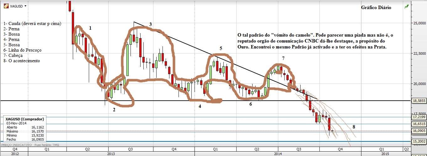 Até pode ser que o analista da CNBC tenha razão com o tal padrão "camelo". No entanto para mim as quedas no Ouro e na Prata são o resultado da quebra dos Triângulos Descendentes e as de hoje mais particularmente fruto da quebra de um Triângulo Simétrico na Prata e de uma Bear Flag no Ouro.