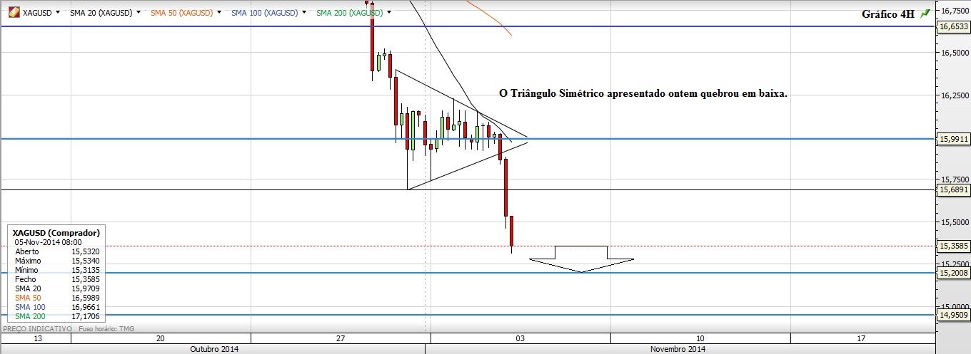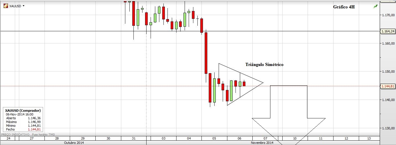 Ontem o Ouro teve uma subida estrondosa, contrariando ou ressaltando, o sentido das fortes quedas que o Preço vinha verificando. Pessoalmente tive que abandonar o Navio. Na água não quis ficar a ver navios e entrei novamente no barco mas agora num rumo diferente. Na quinta-feira coloquei aqui dois gráficos de 4h onde apresentava dois Triângulos Simétricos que para mim sinalizavam a continuação das quedas. De facto esses triângulos foram quebrados em baixa e a projeção dos mesmos correspondeu aos mínimos que o Ouro e a Prata fizeram. No entanto esse impulso dado por esses dois triângulos seria, na minha análise, o mote para mais uma queda de grandeza assinalável o que, não se veio a verificar. Ao invés, o Preço nos dois metais reagiu em forte alta a esses mínimos, que também eram zonas de suporte importantes.