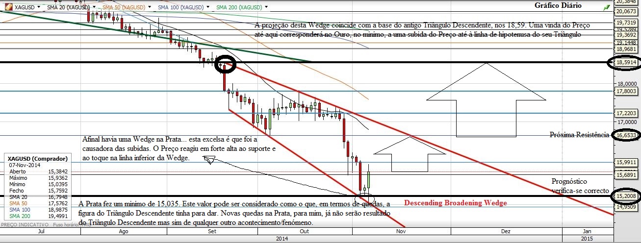 Começando pela Prata, que para mim vai sempre à frente do Ouro, pode-se verificar em primeiro lugar que o Triângulo Descendente já não terá muito mais para oferecer em termos de quedas. A sua projeção do Preço poderia ser mais abaixo, mas o alvo também pode ser considerado já atingido. Juntando isto ao suporte dos 15,20 pode-se começar a considerar este valor, para já, como um fundo atingido (deveremos procurar fundos). Depois e, mais importante, é a figura que entretanto surgiu na Prata e que de facto só na quarta-feira é que apareceu e que com a reação em alta à base da figura se confirmou. Trata-se de uma Descending Broadening Wedge (com inclinação à J.Alves) e que por espantoso que possa parecer atira o Preço exactamente para a base do antigo Triângulo Descendente da Prata nos 18,59. Isto surpreende e choca com a minha ideia de que as quedas deveriam continuar, mas a análise que faço é sempre com base nos mesmos pressupostos técnicos, se esses pressupostos dizem que agora é para subir eu tenho que aceitar e agir em conformidade.