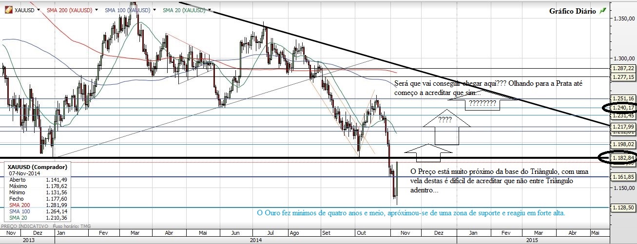 Mais uma vez olhando a Prata percebe-se melhor o Ouro que, com esta vela de sexta ficou quase a tocar na base do seu Triângulo Descendente. A vela tanto no diário como no semanal revelam uma força que não se via há muito tempo e que rejuvenescida não apresenta nenhuma razão para não entrar novamente para dentro do Triângulo, podia ser um teste à base do mesmo, mas acho que é força a mais num só dia para apenas ir testar a base do Triângulo. Se entrar para dentro do Triângulo, quebrando os 1182, será a confirmação de uma nova Força ascendente do Preço.