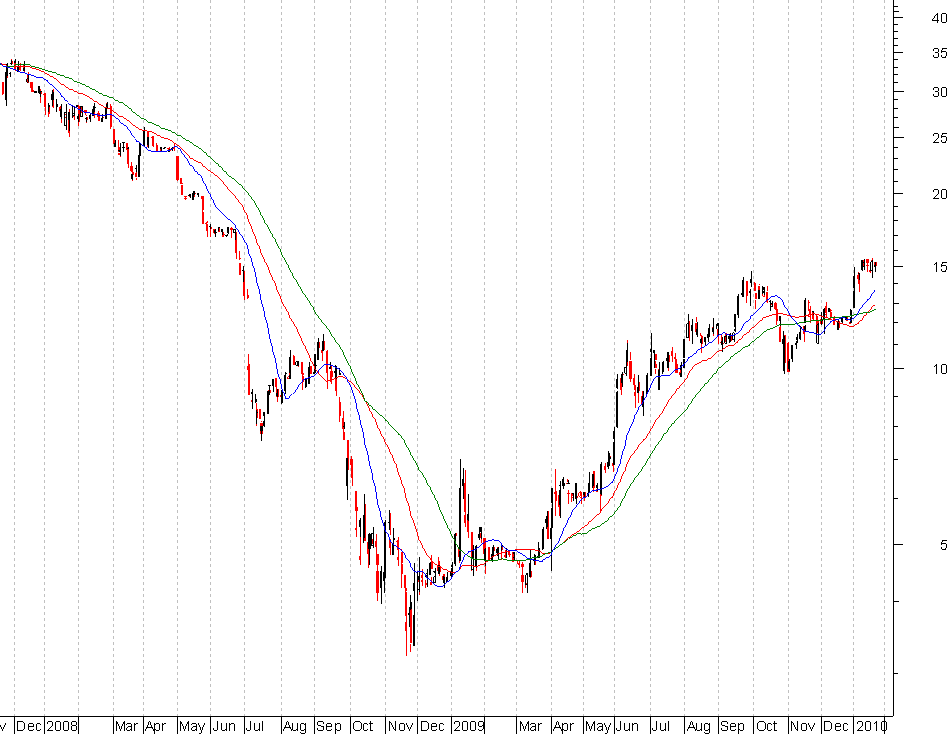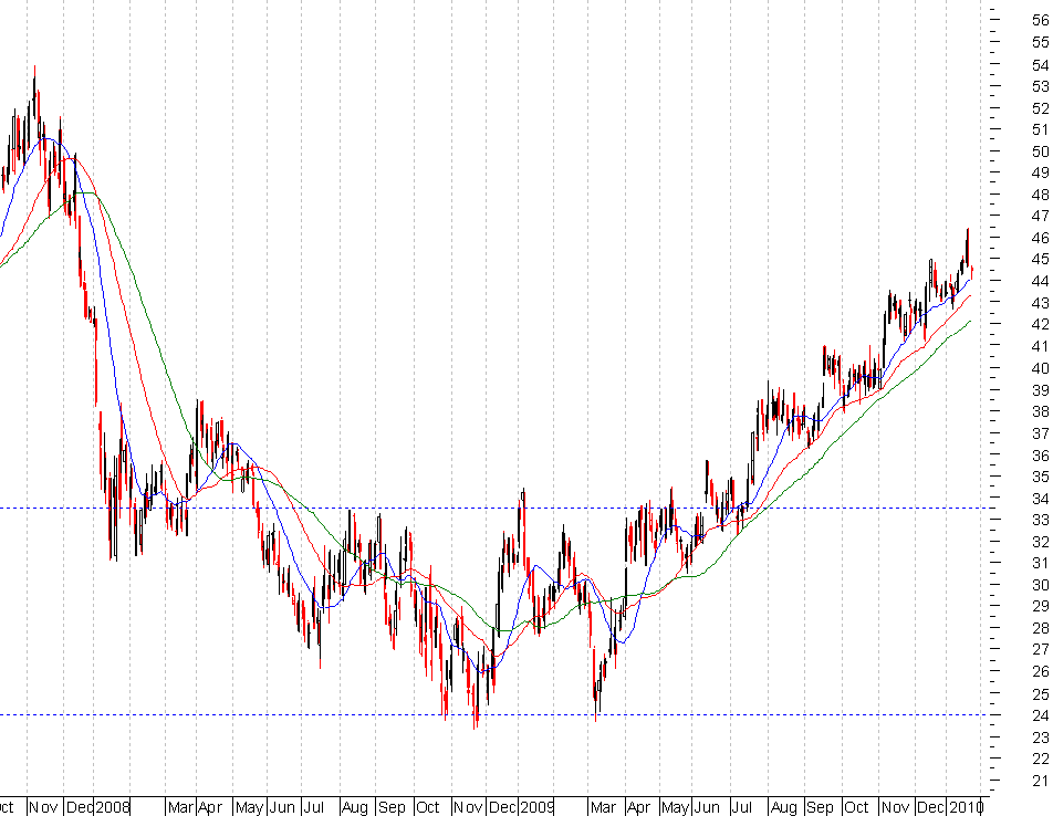 Reparem na perfeição técnica desta acção: duplo fundo em Nov 2008 - Mar 2009 activado com a ruptura dos 24,30. Seguiu-se o reteste e a partir daí a acção nunca mais parou.