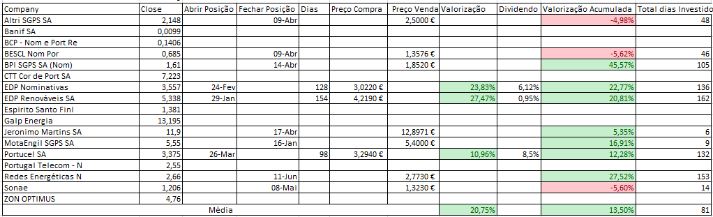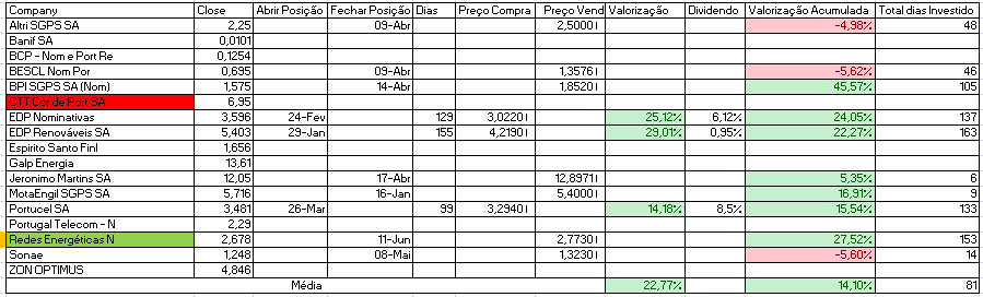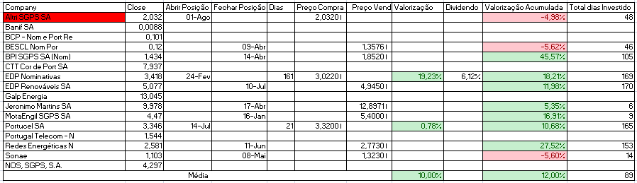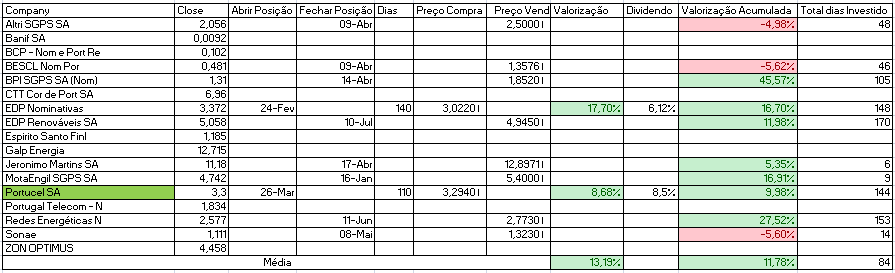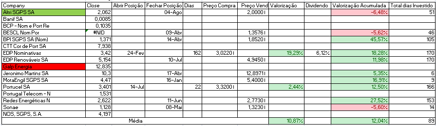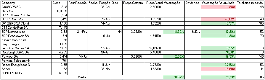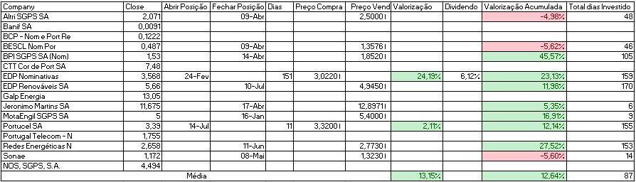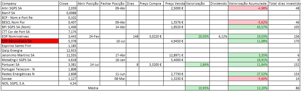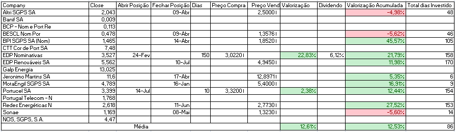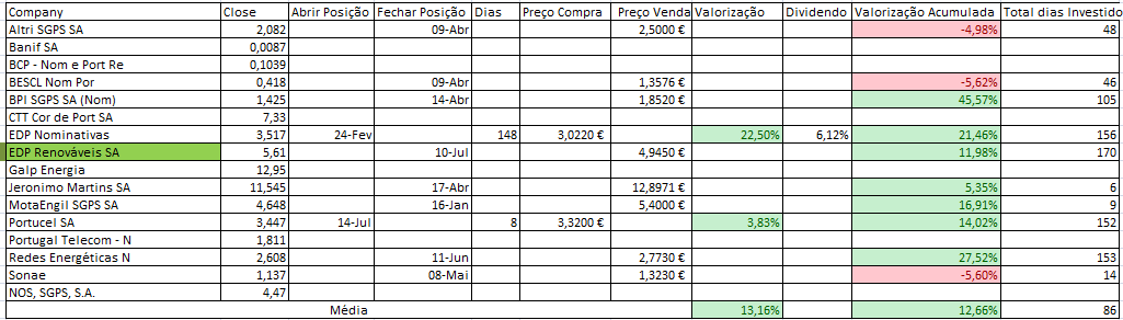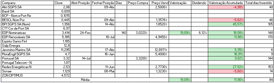 Deixo aqui a rentabilidade da carteira ao final de 7 meses de negociação, que tem tido uma performance bem interessante, tendo em consideração a volatilidade e perdas que tivemos este mês no PSI20.
