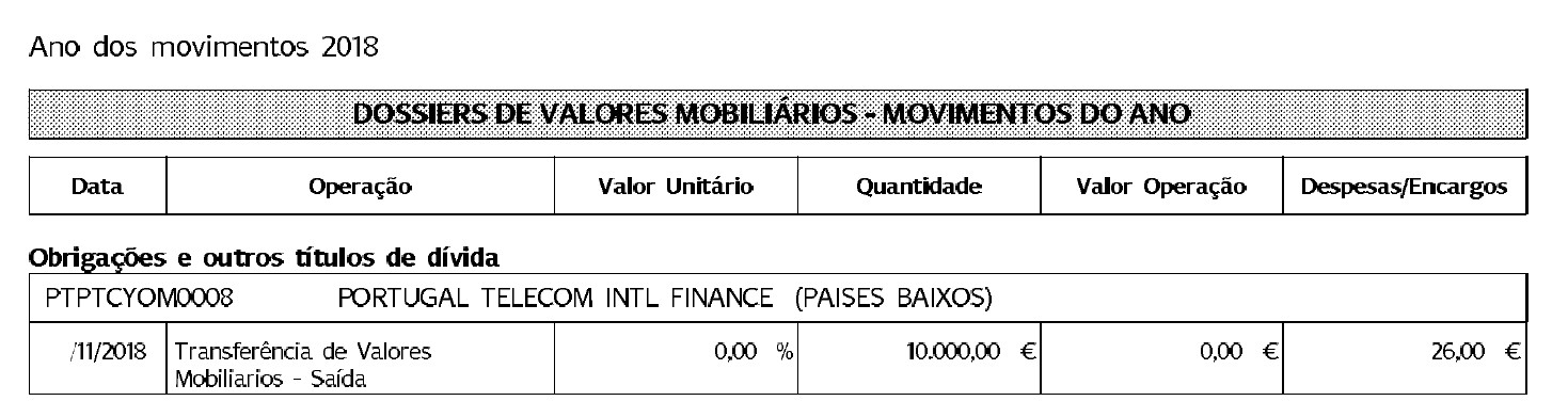 na declaracao de mais valias do meu banco vem na alienacao onerosa de valores mobiliarios estrangeiros as obrigacoes da oi com a data do dia em que transferi as obrigacoes para a oi, setembro 2018. Na declaracao no montante vem 1000 euro por numero de obrigacoes. nao me parece que faca grande sentido porque no dia da transferencia para a oi as obrigacoes valiam 10 centimos cada uma