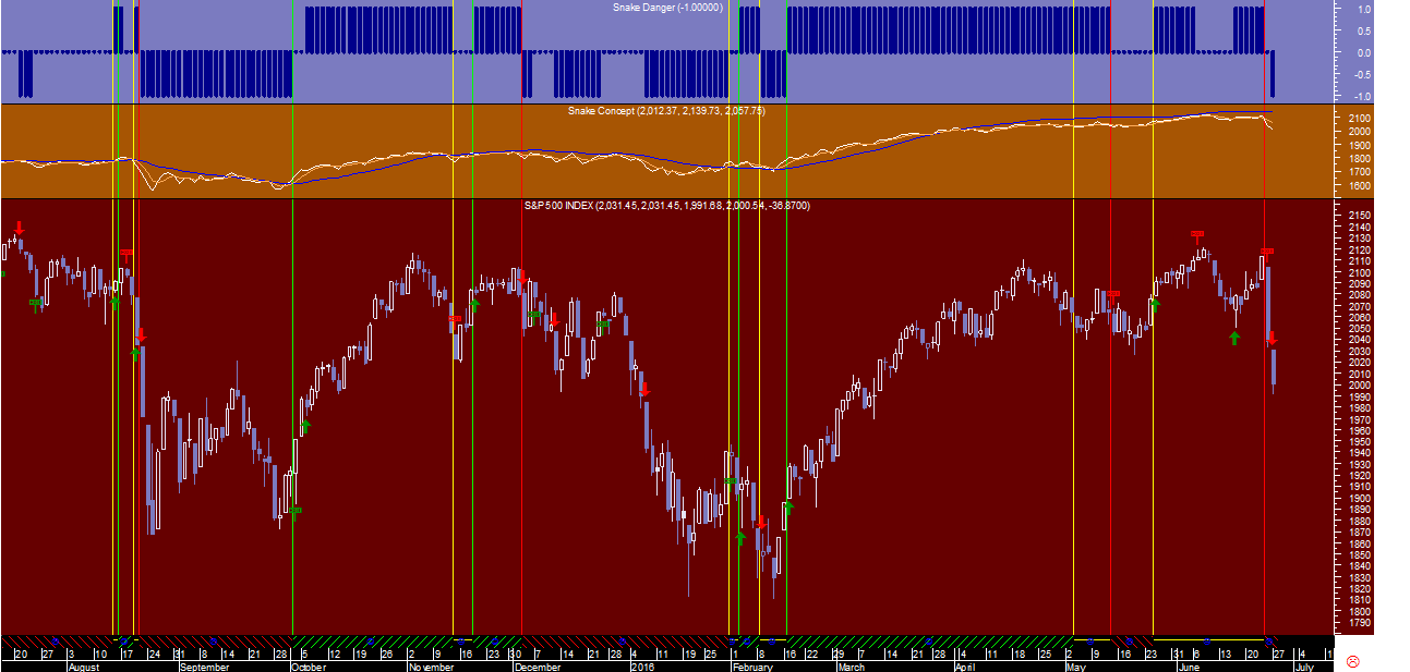 Em relaçao à carteira e índices que vou analisando, tendo em conta as atuais posiçoes que o “Cobra” vai aconselhando, a incrível sessao de ontem foi bastante marcante com resultados muito negativos em: S&P 500 (longo), Soja (longo, só passa a neutro na 2. feira) e Petróleo (longo), foram relativamente neutrais no Milho (neutro), Trigo (curto), EuroDollar (neutro) e Gás Natural (longo) e bastante positivos ou lucrativos no Ouro (longo), Prata (longo), IeneDollar (longo), Euro Stoxx (curto), DAX (curto) e PSI (curto).
